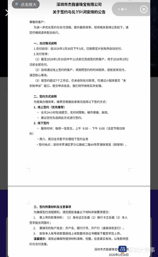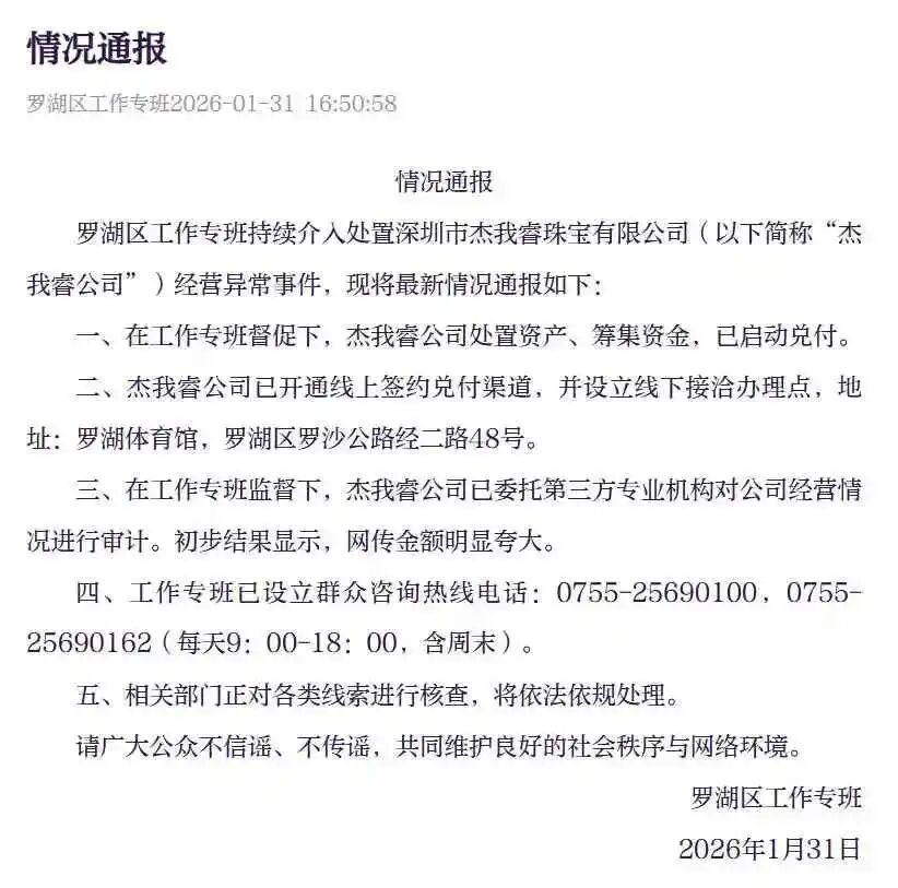 1月31日,深圳市罗湖区工作专班发布情况通报:罗湖区工作专班持续介入处置深圳市杰我睿珠宝有限公司(以下简称杰我睿公司)经营异常事件,现将 最新情况通报如下: 一、在工作专班督促下,杰我睿公司处置资产、筹集资金,已启动兑付。 二、杰我睿公司已开通线上签约兑付渠道,并设立线下接洽办理点,地址:罗湖体育馆,罗湖区罗沙公路经二路48号。 三、在工作专班监督下,杰我睿公司已委托第三方专业机构对公司经营情况进行审计。初步结果显示,网传金额明显夸大。 此前报道: 近日,杰我睿公司黄金兑付危机引发市场关注。 近日,深圳水贝市场一家名为深圳市杰我睿珠宝有限公司(下称"杰我睿")的贵金属平台陷入兑现危机。1月28日,《华夏时报》记者来到深圳水贝杰我 睿公司,发现大门紧闭,透过玻璃门向内望去,里边挂着"感谢粉丝们的支持,杰我睿会一直都在"的横幅,而侧面墙壁上的一面写着"赠永不跑路的杰"的 锦旗,与空无一人的屋子形成鲜明的对比,锦旗上的落款时间是2025年12月。 对于杰我睿公司经营异常引发的关注,1月28日,罗湖区工作专班发布情况通报称,"第一时间组建工作专班介入,督促企业落实主体责任;目前杰我睿负 责人及相关核心管理人员均在岗, ...