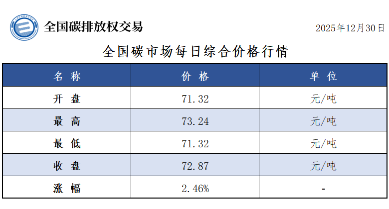 新华财经北京12月30日电 据微信公众号"全国碳交易",12月30日全国碳市场综合价格行情为开盘价71.32元/吨,最高价73.24元/吨,最低价71.32元/ 吨,收盘价72.87元/吨,收盘价较前一日上涨2.46%。 (文章来源:新华财经) | 名 称 | 价 格 | 单 位 | | --- | --- | --- | | 开 盘 | 71. 32 | 元/吨 | | 最 高 | 73. 24 | 元/吨 | | 最 低 | 71. 32 | 元/吨 | | 收 盘 | 72. 87 | 元/吨 | | 涨幅 | 2. 46% | | | 各年度 | 开盘价 | 最高价 | 量低价 | 收盘价 | | 日咸交量 | 日成交额 | 累计成交量 | 累计成交额 | 交易方式 | | --- | --- | --- | --- | --- | --- | --- | --- | --- | --- | --- | | 碳排放配频 | | (元/吨) (元/吨) (元/吨) (元/吨) | | | | 日成交量 | (元) | (吨) | (元) | | | | | | | | | 29.930 | 2.167. ...