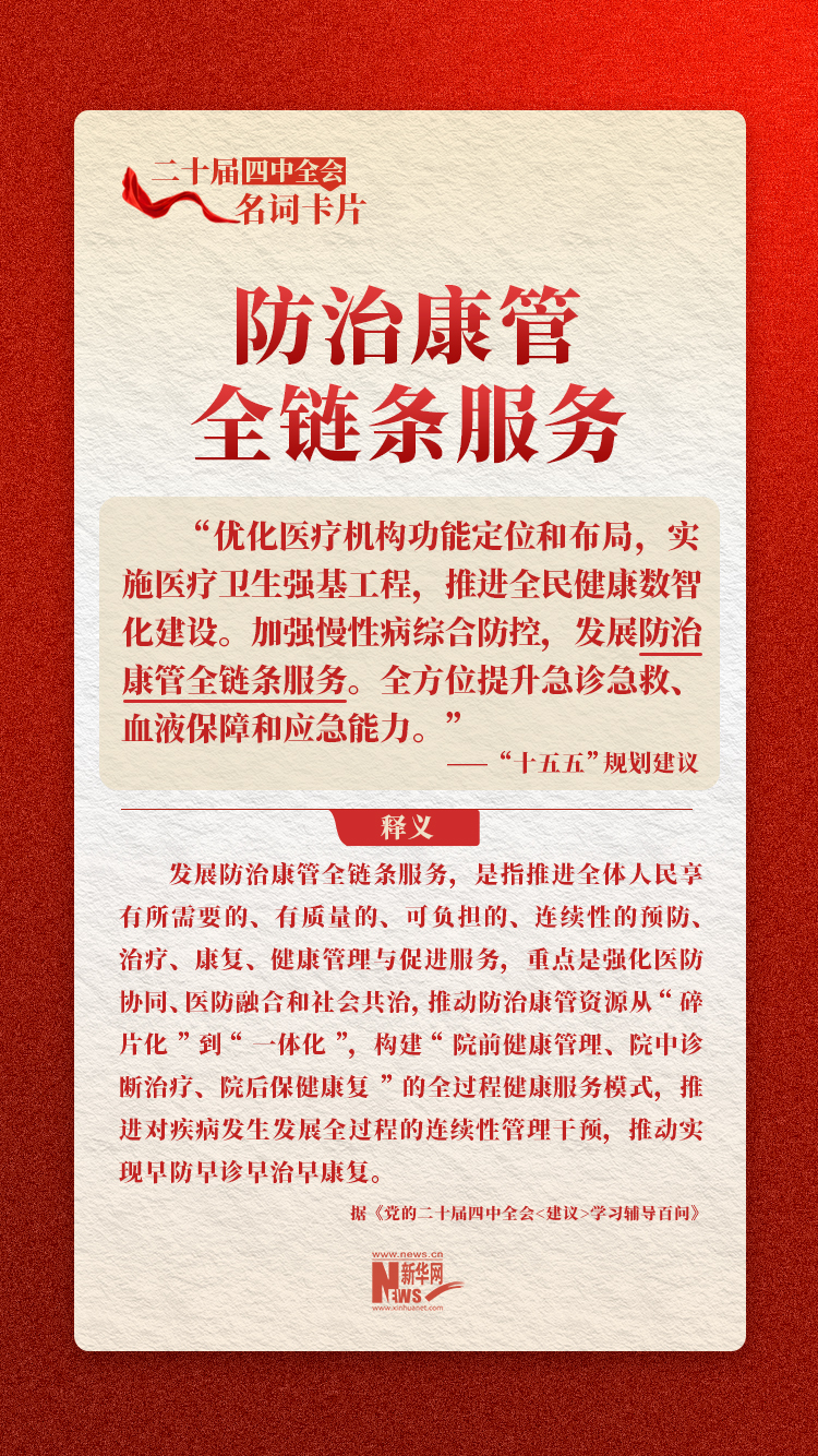 一十周四峰 名词卡片 防治康管 全链条服务 "优化医疗机构功能定位和布局,实 施医疗卫生强基工程,推进全民健康数智 化建设。加强慢性病综合防控、发展防治 康管全链条服务。全方位提升急诊急救、 血液保障和应急能力。" "十五五"规划建议 释义 发展防治康管全链条服务,是指推进全体人民享 有所需要的、有质量的、可负担的、连续性的预防、 治疗、康复、健康管理与促进服务,重点是强化医防 协同、医防融合和社会共治,推动防治康管资源从"碎 片化"到"一体化",构建"院前健康管理、院中诊 断治疗、院后保健康复"的全过程健康服务模式,推 进对疾病发生发展全过程的连续性管理干预,推动实 现早防早诊早治早康复。 延伸阅读 如何发展防治康管全链条服务: 一方面,需要打通预防、治疗、康复、健康管理与促进服务全链条。 以心脑血管疾病、癌症、糖尿病、慢性呼吸系统疾病等重大慢性病防治为切入点,深入实施健康生活 方式行动,大力开展健康体重管理年活动,逐步降低儿童和成人肥胖率,倡导身心健康,发挥医务人员健 康教育指导作用,加强高血压、高血糖、血脂异常等重点人群生活方式指导,努力减缓慢性病上升趋势, 有效控制慢性病发生发展。 加强防病治病各环节 ...
