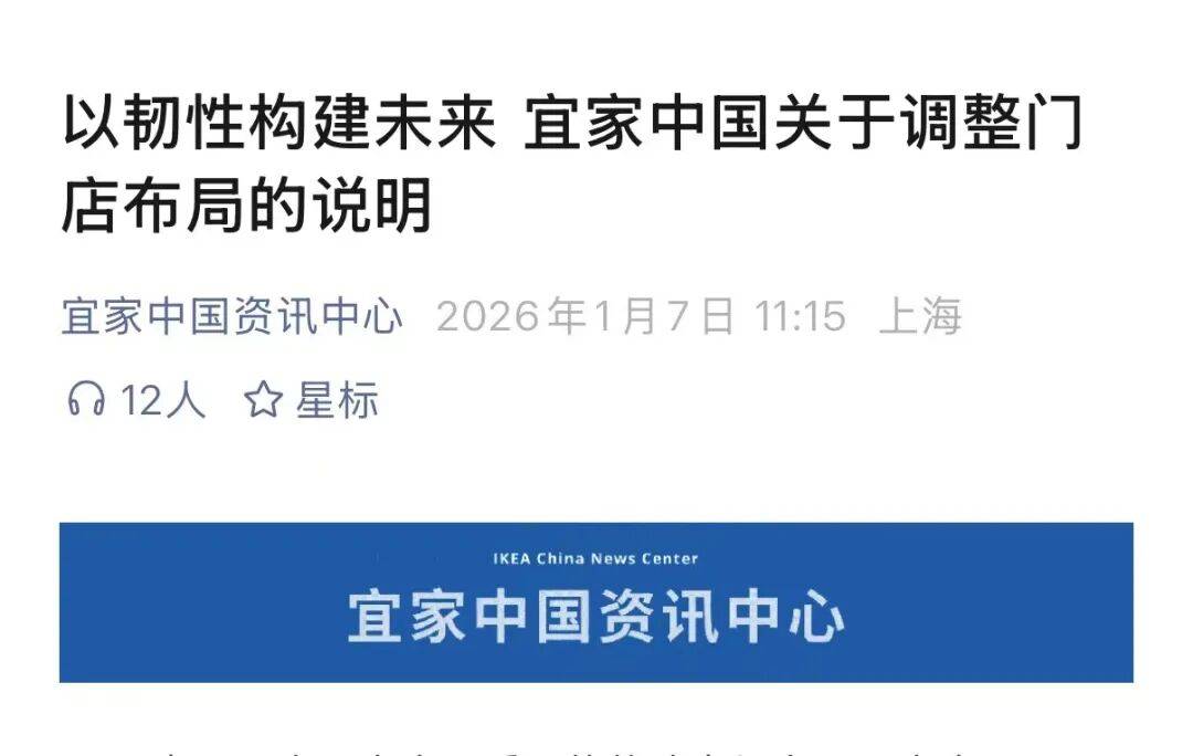 经济观察报 记者 张锐 1月7日,家居零售企业宜家中国通过官方微信及官网发布《以韧性构建未来 宜家中国关于调整门店布 局的说明》(下称《说明》)称,决定自2026年2月2日起停止运营包括宜家上海宝山商场、宜家广州番 禺商场等七个线下门店。 同日,经济观察报记者先后走访广州番禺商场和佛山商场。多位长期在宜家购物的消费者向记者表示, 近年前往宜家门店消费时觉得客流量下降明显,以往排队结账盛况不再。一位在佛山商场工作约九年的 清洁人员说:"今年客流量较高峰时期减少超过一半。" 1月8日,宜家中国方面回复经济观察报记者表示,此次调整并不意味着相关门店"无法继续经营",而是 宜家面向长期韧性与未来增长所采取的主动转型。 "门店客流下降明显" 宜家中国发布《说明》当天,广州番禺商场暂停营业。 1月7日,经济观察报记者在宜家广州番禺商场门口看到一则《暂停营业通知》称,因渠道布局调整原 因,该店于1月7日至8日暂停营业,并将于1月9日恢复营业。 一位在上述门店负责维持秩序的工作人员向记者表示,(停业)通知来得比较突然,暂停营业主要是因 为"店里要开会,大约二十多人"。 肖女士家住宜家广州番禺商场附近,经常在宜家购物。她告诉经 ...
