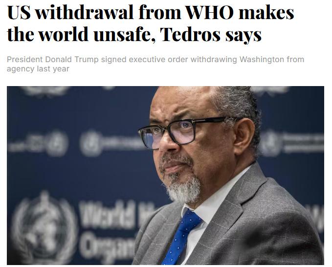 谭德塞:美国即将退出世卫,后果"伤及自身、危及全球" 中新网1月14日电 据外媒报道,当地时间13日,世界卫生组织总干事谭德塞表示,美国即将正式退出世 卫组织,这将削弱全球卫生安全,并使美国在面对危机时更为脆弱。 据报道,谭德塞表示,他对此决定"深感遗憾",并指出其影响将远超美国本土范围。 他认为,美国退出世卫组织对美国和世界其他国家来说都是一种损失,这意味着美国自身和世界其他国 家的安全都将受到威胁,"这真的不是一个正确的决定,我想直言不讳地说出来"。 谭德塞还称,希望美国重新考虑这一决定,重新加入世卫组织。他补充说,世卫组织开展的许多工作都 惠及美国,尤其是在卫生安全领域,"如果不与世卫组织合作,美国就无法确保自身安全"。 图片来源:外媒报道截图 来源:中国新闻网 编辑:付健青 广告等商务合作,请点击这里 本文为转载内容,授权事宜请联系原著作权人 中新经纬版权所有,未经书面授权,任何单位及个人不得转载、摘编或以其它方式使用。 关注中新经纬微信公众号(微信搜索"中新经纬"或"jwview"),看更多精彩财经资讯。 谭德塞还表示,通过预算调整等措施,世卫组织正逐步解决资金问题。 此前报道,2025年1月20日 ...