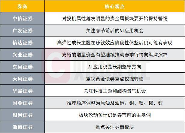 Group 1: Precious Metals and Market Trends - The precious metals sector is showing increasing speculative attributes, warranting caution [2] - The current market is experiencing a style shift from small-cap to large-cap stocks and from themes to quality [2] - The overall trend indicates a potential for profit margin recovery in cyclical sectors, driven by a shift in Chinese policy from expansion to quality improvement [2] Group 2: AI and Technology Opportunities - There is a focus on AI applications and energy storage as key growth areas, with expectations for recovery in lithium battery materials and storage sectors [3] - The AI industry remains a long-term focus, with significant policy support and market optimism surrounding its applications [5] - The technology theme, including AI applications and structural recovery opportunities, is highlighted as a key area for investment [7] Group 3: Spring Market Dynamics - The spring market is expected to continue its upward trend, supported by ample liquidity and positive domestic fundamentals [5] - High elasticity growth themes may still perform well after a phase of profit-taking, with potential for further gains in February [4] - Sector rotation is anticipated to be a dominant theme leading up to the Spring Festival, with a focus on structural opportunities [9] Group 4: Commodity Recommendations - A recommendation has been made to adjust the order of investment focus to include crude oil, copper, aluminum, tin, and lithium, reflecting a shift towards industrial pricing [8] - The emphasis on physical assets is expected to strengthen, with a focus on sectors like chemicals and consumer goods benefiting from domestic recovery [8] Group 5: Market Sentiment and Future Outlook - The market sentiment remains cautious but optimistic, with expectations for continued support from domestic policies and liquidity [5][6] - The potential for structural recovery in manufacturing and resource sectors is noted, with clear paths for profit recovery [9] - The upcoming credit and inflation data in January may provide additional positive signals for the market [4]