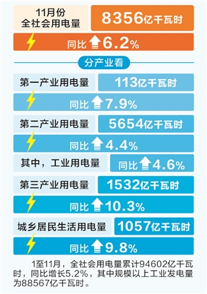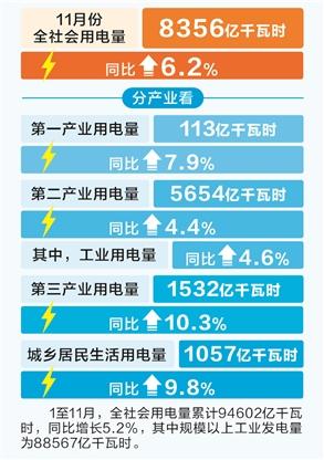 (据新华社电) (原标题:时报数说 11月份全社会用电量 同比增长6.2%) ...