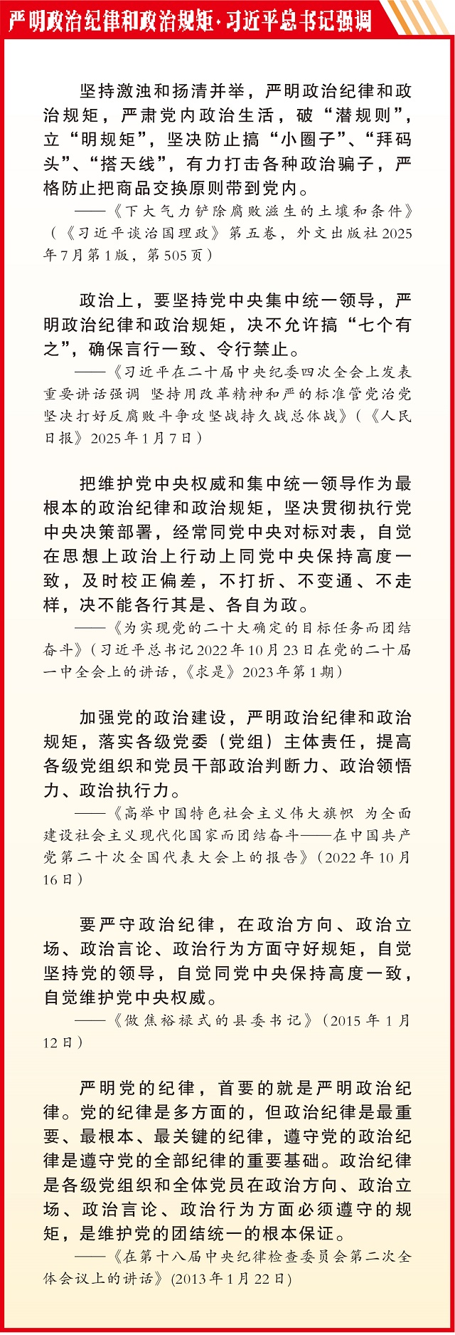 中央纪委国家监委网站 王雅婧 中国共产党是靠革命理想和铁的纪律组织起来的马克思主义政党,纪律严明是我们党的光荣传统和独特优 势。党的十八大以来,以习近平同志为核心的党中央高度重视纪律建设,把党的纪律建设纳入党的建设总体 布局,习近平总书记就加强党的纪律建设发表一系列重要讲话,提出许多具有思想性、标志性、原创性的重 要观点,明确要求全面加强党的纪律建设,增强纪律建设的政治性、时代性、针对性,为加强党的纪律建设 提供了根本遵循,指明了正确方向。认真学习领悟习近平总书记关于全面加强党的纪律建设,特别是关于严 明党的政治纪律和政治规矩的重要论述,对于广大党员、干部立足实际做好当前和今后一个时期的工作,具 有重要现实意义。 "两个维护"是党的十八大以来,我们党在革命性锻造中形成的共同意志,是我们党不断从胜利走向胜利的宝 贵经验。广大党员干部要把"两个维护"作为党的最高政治原则和根本政治规矩,把维护党中央权威和集中统 一领导内化于心、外化于行,自觉坚持党的领导,自觉同党中央保持高度一致,决不允许上有政策、下有对 策,决不允许有令不行、有禁不止,决不允许在贯彻执行中央决策部署上打折扣。 全面从严治党,必须注重政治上的要求, ...