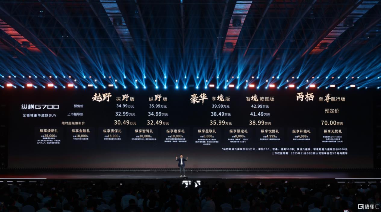 2025年10月19日,以"至 前所未至"为主题的纵横G700全球上市发布会在安徽芜湖宜居国际博览中心落下帷幕,作为纵横旗下首款量产车型,新车定 位"全领域豪华越野SUV",共推出4个版型,官方指导价为32.99万元—41.49万元,限时超级焕新价30.49万元起,并带来十大上市专属购车权益,旨在为用 户提供从购车、用车到玩车的全链路尊享体验。作为纵横首张成绩单,G700的横空出世,正是纵横以技术创新打破边界,以品类创新定义豪华,以场景创 新重塑价值的集中体现。而纵横更是以G700的全领域实力,成就中国汽车工业从大变强的新里程碑,引领属于中国、面向全球的豪华越野新阶段。 纵横G700上市购车权益: ① 纵享焕新礼:享25,000元超级置换现金补贴 ② 纵享金融礼:享"3年20万0息"金融方案(价值至高18,000元) ③ 纵享质保礼:首任非营运整车终身质保(价值18,000元) ④ 纵享智驾礼:华为乾崑智驾®ADS 4 高阶功能包补贴(价值20,000元) ⑤ 纵享奢享礼:限时升级莱斯康剧院级立体音(价值10,000元) ⑥ 纵享星联礼:限时赠送苍穹互联卫星通讯功能(价值6,000元) ⑦ 纵享限定礼:限时赠 ...