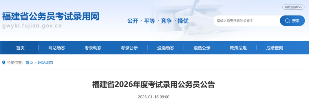 1月16日,福建省2026年度考试录用公务员公告发布,计划录用4723名公务员(含参公人员),来看详情—— 报考入口↓ 时间安排↓ 1月19日(周一)9:00—1月23日(周五)17:00报名; 1月20日(周二)9:00—1月26日(周一)17:00报名资格审查、专业资格的申诉审核; 1月29日(周四)9:00—1月30日(周五)24:00笔试确认,完成笔试确认后,方可取得笔试资格; 1月30日(周五)24:00之后无法修改考试地点; 3月6日(周五)9:00起下载打印准考证; 3月14日(周六)9:00—11:00《行政职业能力测验》; 3月14日(周六)14:00—16:30《申论》; 3月15日(周日)9:00—11:00《公安机关招录人民警察专业科目》,招考职位需要加试其他专业科目的,具体安排由招录单位在福建省公务员考试录用网 (http://gwykl.fujian.gov.cn)另行公告; 4月上旬公布笔试成绩; 4月中旬完成面试,5月完成体检、考察;报考人民警察职位的,体检前应当按照职位要求参加体能测评、心理测评。 公告全文如下↓ 根据公务员法和《公务员录用规定》等法律法规,福建省公务员局决定 ...