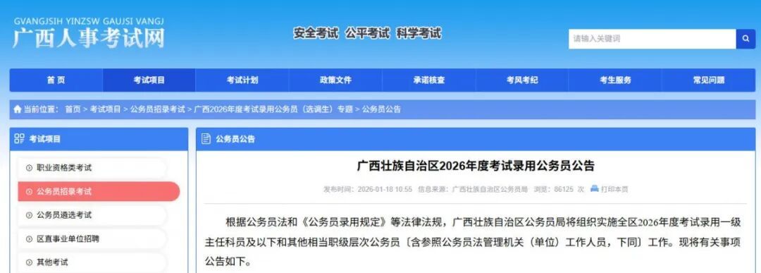 来源:南国早报 1月18日,自治区公务员局发布《广西壮族自治区2026年度考试录用公务员公告》,今年广西区考计划招录5630人。报考人员可在1月19日8时至1月25日18 时期间登录网上系统报名,公共科目笔试将于3月14日举行。 | GVANGJSIH YINZSW GAUJSI VANGJ 广西人事考试网 | | | 安全考试 公平考试 科学考试 | | | | --- | --- | --- | --- | --- | --- | | | | 请输入关键词 | | | ơ | | 首页 考试项目 | 考试计划 | 政策文件 考风考纪 | 承诺核查 | 考生服务 | 常见问题 | | ↑ 当前位置: 首页 > 考试项目 >公务员招录考试 > 广西2026年度考试录用公务员(选调生)专题 >公务员公告 | | | | | | | 日前有限公司 | 目 公务员公告 | | | | | | 2 职业资格类考试 | | 广西壮族自治区2026年度考试录用公务员公告 | | | | | ◎ 公务员招录考试 | | 发布时间:2026-01-18 10:55 作息来源:广西壮族自治区公务资局 浏览:86125 次 ▲ ...