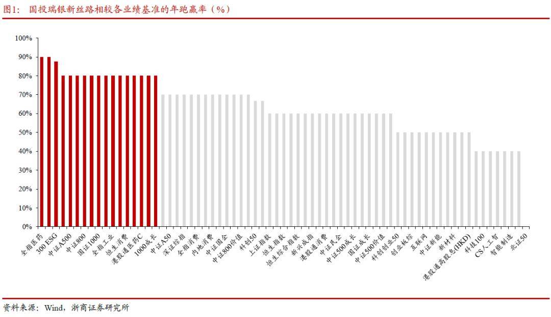 证券研究报告 | 策略专题研究 | 中国策略 策略专题研究 报告日期:2025 年 12 月 04 日 公募新规下,基金经理如何选择最优业绩比较基准? ——案例分析:国投瑞银新丝路 核心观点 公募基准新规明确了业绩基准的选取原则和信披规范,突出并强化业绩基准的日常约 束作用。预计 2026 下半年将有相当比例的权益类公募基金存在调整业绩基准的需求, 因此我们构建出独家的"选择基准工具表",并以"国投瑞银新丝路"作为分析案例, 从跑赢胜率、跑赢含金量、匹配程度、跑赢程度、超额稳定性、配平压力六大维度拆 解并筛选出最适合其参照的业绩基准。从案例综合结果来看,我们认为国投瑞银新丝 路最适合参照的业绩基准是中证 800。此外,国证 1000、中证 A500、中证 500、中证 全指等也可纳入备选,需要基金管理人进行更全面的考量。 ❑ 维度一:跑赢胜率——相对于基准的年跑赢率 我们统计基金自成立以来,跑赢所有一类库比较基准年度数量的占比,即基金的 年跑赢率,作为跑赢胜率指标。理想目标是年跑赢率越高越好,高胜率表明基金 能够在多数市场环境下具备持续战胜基准的能力。 ❑ 维度二:跑赢含金量——业绩基准的夏普比 单纯的高胜率 ...