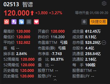 智谱(02513.HK)今日正式登陆港交所主板。公司股票开盘报120港元,较每股116.20港元的发行价上 涨3.27%。不计手续费,每手100股可盈利380港元。此前暗盘交易中,该股收涨6.02%至123.2港元。 智谱此次上市获得了市场的高度关注。其香港公开发售部分录得约1159.46倍的巨额超额认购。由于认 购火爆,公开发售股份数目最终增至748.39万股,占全球发售股份总数的20%。国际配售部分亦获得 15.28倍认购。 | 02513 智谱 | | | | --- | --- | --- | | 120.000 + +3.800 +3.27% | | 等待开盘 01/08 09:20 | | * F O F F | | 快速交易 | | 最高价 120.000 | 开盘价 120.000 | 成交量 612.45万 | | 最低价 120.000 | 昨收价 116.200 | 成交额 8.13亿 | | 平均价 132.802 | 市盈率TM 亏损 | 总市值 528.28亿 (m) | | 振 幅 -- | 市盈率(静) 亏损 | 总股本 4.4亿 | | 换手率 2.84% | 市净率 -7. ...