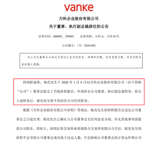 炒股就看金麒麟分析师研报,权威,专业,及时,全面,助您挖掘潜力主题机会! 来源:南财社 困在千亿负债中的万科,又迎来重磅消息。 1月8日晚,万科公告称,郁亮因到龄退休从万科辞去所有职务,不再在万科工作。 值得一提的是,郁亮从1990年就加入万科了,从证券部起步,一步步做到董事会主席,到如今退休,已 经在万科工作了36年。如此老员工,万科在辞职公告中却并有对他表示感谢。确实相当罕见。 从过往的高管辞职公告来看,万科通常都会在最后对其在任职期间做出的贡献表示感谢。 比如2017年-2021年,公司前董事李强强、唐绍杰、肖民,以及监事廖绮云辞职时,万科都在公告最 后,对其在任职期间所做的贡献表示衷心感谢。 王石从万科卸任后,郁亮作为接班人,正式接手万科。 回顾当时的公告,2017年6月30日,万科年度股东大会正式通过新一届董事会选举,王石不再担任董事 会主席职务,郁亮正式接棒。董事会决议公告中,也表示对王石过去33年贡献了肯定,委任其为董事会 名誉主席。 相比之下,郁亮的退休离任公告,没有感谢,也没提贡献,显得过于简单和冷静了。 而在财新的报道中提到一件有意思的事。万科公司文化崇山体育风尚,王石对赛艇、郁亮对马拉松 ...