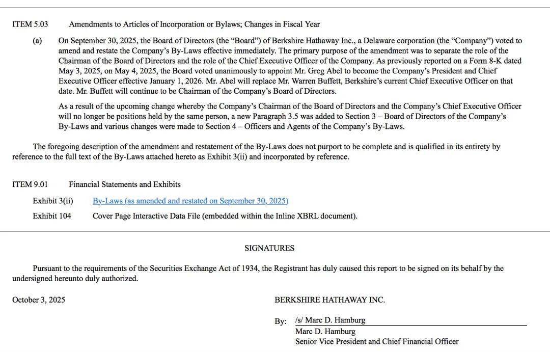 这一举措为公司现任副董事长格雷格·阿贝尔明年初接任首席执行官做好了准备。 就在本周早些时候,伯克希尔发布公告称,将以97亿美元收购西方石油公司旗下化工业务OxyChem。若交易最终达成,这将是伯克希尔自2022年以来金 额最高的一笔收购。值得注意的是,这笔交易由格雷格·阿贝尔策划,是其接班人身份明确以来主导的首个重大并购。 伯克希尔调整公司章程 将董事会主席与CEO职务分离 SEC披露文件显示,伯克希尔董事会投票决定修订并重述公司章程,自即日起生效。此次修订的主要目的是将董事会主席职务与公司首席执行官职务进行 分离。 当地时间周五(10月3日),美国知名投资人沃伦·巴菲特旗下公司伯克希尔·哈撒韦(下简称伯克希尔)在提交给美国证券交易委员会(SEC)的文件中宣 布,公司董事会已于9月30日投票通过修订公司章程,该章程立即生效,正式将董事会主席与首席执行官的角色分离。 | Exhibit 3(ii) | By-Laws (as amended and restated on September 30, 2025) | | --- | --- | | Exhibit 104 | Cover Page Interac ...