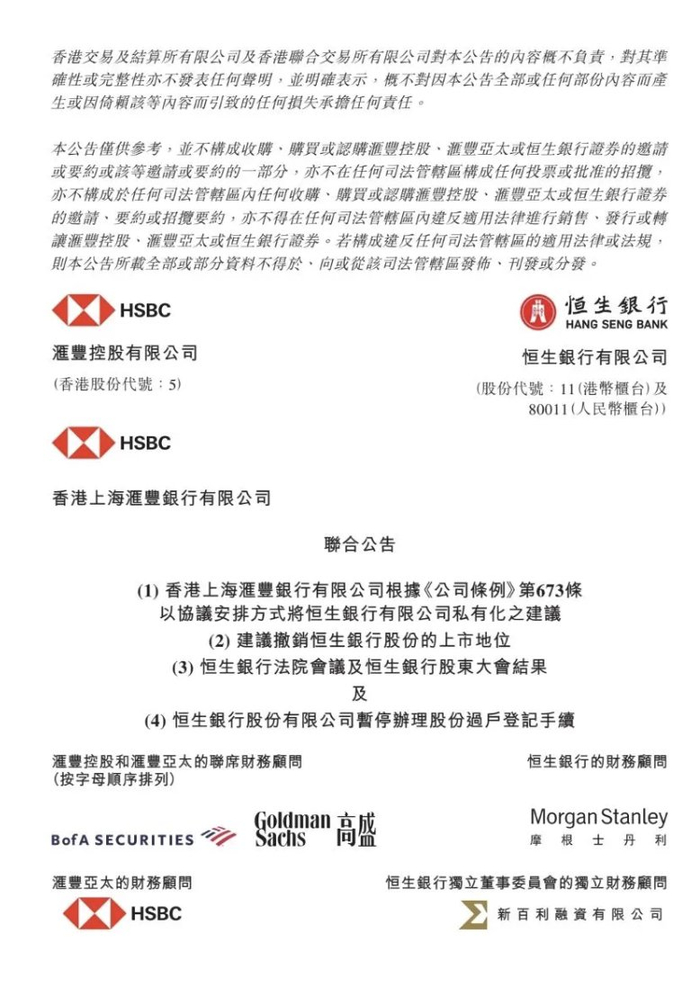 【#恒生指数将再无恒生银行#】#恒生银行成为汇丰全资附属公司# 上市53年的恒生银行(0011.HK), 即将退出港交所舞台。2026年1月8日,恒生银行召开股东大会,以85.75%赞成、5.94%反对的投票结果 正式通过私有化决议。这意味着汇丰控股获准收购恒生银行全部股份,恒生银行成为汇丰全资附属公 司。 在获得恒生银行股东批准,并得到香港高等法院的认可后,私有化决议预期将于2026年1月26日生效, 并预计于1月27日从香港交易所撤销上市地位。 值得注意是的,此前2025年12月30日,香港恒生指数公司表示,若恒生银行私有化决议获股东大会及法 院会议批准,恒生银行将于2026年1月14日收市后从恒生指数、恒生综合指数等共41个指数及子指数当 中剔除,相关调整自2026年1月15日起生效。 这也意味着,恒生指数将再无恒生银行。(21财经) 香港交易及結算所有限公司及香港聯合交易所有限公司對本公告的內容概不負責,對其準 確性或完整性亦不發表任何聲明,並明確表示,概不對因本公告全部或任何部份内容而產 生或因倚颠誇內容而引致的任何損失承擔任何責任。 (股份代號:11(港幣櫃台)及 80011(人民幣櫃台)) 本公 ...