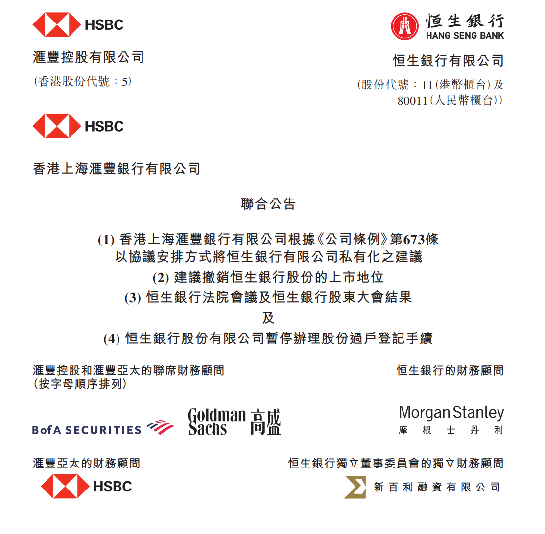【环球网财经综合报道】1月8日晚间,香港金融市场迎来一则重磅消息。汇丰控股(HK00005)与恒生银行(HK00011)在香港联交所披露联合公告,宣布 汇丰亚太私有化恒生银行的计划在当日举行的恒生银行法院会议及股东大会上顺利获得通过。这一决策犹如一颗巨石投入平静湖面,在香港金融界激起层层 涟漪。 根据公告内容,在取得香港高等法院的批准并满足相关条件后,恒生私有化计划将于2026年1月26日正式生效,预计于1月27日从港交所撤销上市地位。恒生 银行自1972年成功上市以来,已在公开交易市场走过了53个春秋。此次私有化意味着这家老牌银行将结束其漫长的公开交易历程,转身成为汇丰控股的全资 附属公司,开启发展新篇章。 恒生银行在香港金融领域占据着举足轻重的地位。其市值超2500亿元,多年来凭借稳健的经营和优质的服务,赢得了广大投资者的信赖与支持。此次私有化 决定,无疑是在当前复杂多变的金融环境下,汇丰控股基于自身战略布局和恒生银行长远发展所做出的重大抉择。 除了私有化进程备受关注外,恒生银行在指数成分股中的变动也牵动着市场的神经。恒生指数公司早在去年12月30日就明确表示,倘若恒生银行私有化建议 获得批准,该股将于2 ...