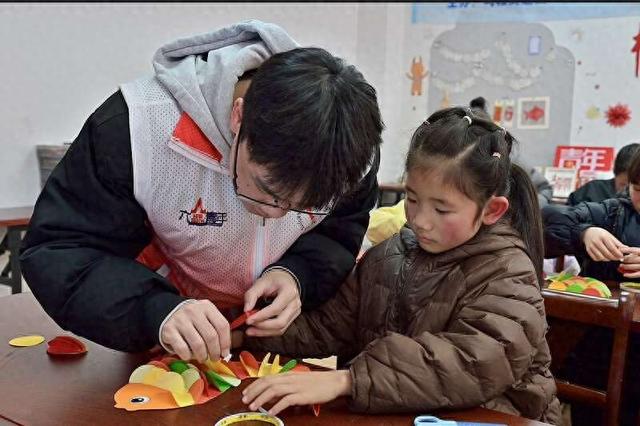 中青报·中青网记者谭思静 实习生 彭萍 春节的脚步近了,年味愈发浓烈。南京六合区马鞍街道大圣村青年之家里,为村里娃办的"爱心寒托 班"正热火朝天地进行着。 "大家知不知道,为什么过年餐桌上总要有一条鱼?"志愿者老师的话音刚落,孩子们的小手就举得老 高。"我知道!代表每年都有多余的钱和粮食!"一个小男孩抢着回答。课堂瞬间炸开了锅,孩子们七嘴 八舌地讨论起"鲤鱼跃龙门"的传说,还有人讲起奶奶做的红烧鱼。 大学生志 愿者正在帮寒托班里的孩子粘"鱼鳞"。彭萍/摄 这热闹的一幕,发生在六合团区委开办的"童乐棠邑暖冬相伴"爱心寒托班里。为解决家长假期孩子看护 难的问题,今年春节前夕,六合区首次试点开办寒托班,3个点位招收了50余名学员,重点覆盖新就业 群体子女、留守儿童等群体。 课堂上,孩子们在大学生志愿者老师的帮助下,忙着制作"年年有余"挂饰。红色卡纸剪成鲤鱼形状,一 张张圆形卡纸对折成鱼鳞贴在鱼身上,再用彩色方形卡纸折成扇子作鱼尾。有个小男孩举着自己做的 鱼,得意地向旁边的小伙伴炫耀:"你看我的鳞片,排列得整齐不?"旁边的小姑娘却皱着眉头,认真往 鱼身上涂胶水:"我这个尾巴怎么立不起来?" 盐城师范学院学生胡蕊,穿梭 ...