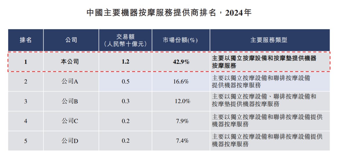 乐摩科技于2016年推出"乐摩吧"品牌,致力于在商业综合体、影院、交通枢纽场所(包括机场、高铁站 等)等消费场景为消费者提供机器按摩服务。于2025年11月15日,集团已为机器按摩服务设立超过 48,000个服务网点,投放超过533,000张机器按摩设备,覆盖中国31个省级行政区及337个城市。 乐摩科技的服务网点由2022年12 月31日的21,727个服务网点扩展至2024年12月31日的45,993个服务网 点,CAGR约为 45.49%。在消费者覆盖方面,集团拥有稳固的市场地位,于2025年11月15日,累计可 识别服务消费者总数超过1.74亿,注册会员人数超过4,000万名。 乐摩科技不设强制回补机制,发售1成于作公开发售,整体协调人可重新分配至最多15%。乐摩科技未 有引入基石投资者。 招股书显示,乐摩科技通过位于中国各地人流密集的公共场所的各服务网点的机器按摩设备提供按摩服 务。根据弗若斯特沙利文的资料,于2022年至2024年的三个连续年度,按交易额计,集团在中国所有机 器按摩服务提供商中排名第一,相应年度的市场份额分别为33.9%、37.3%及42.9%。按收入计,于2024 年,集团亦于中 ...