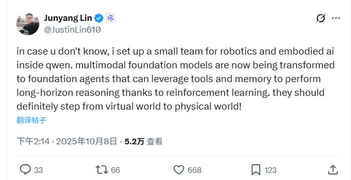 阿里巴巴集团已成立内部机器人团队,正式加入全球科技巨头争相打造AI实体产品的竞赛。 10月8日周三,阿里巴巴通义千问的技术负责人林俊旸周三在社交媒体X上透露,阿里已成立"机器人和 具身AI小组"。这标志着,阿里从AI软件向硬件应用领域的战略延伸。 此举正值全球科技巨头纷纷布局机器人领域之际。同在周三,日本软银集团宣布收购ABB的工业机器 人业务,进一步强化其在"物理AI"领域的布局。 阿里云最近首次布局具身智能,上月领投了中国机器人初创公司自变量机器人(X Square Robot)的1.4 亿美元融资。 两周前的2025云栖大会上,阿里巴巴CEO吴泳铭表示,未来五年全球AI投资总额加速增长到4万亿美 元,阿里必须保持同步。除了2月公布的未来三年为云和AI硬件基础设施投入3800亿元,阿里还计划追 加投入。 多模态基础模型转化为基础智能体 理应迈向现实世界 除了透露设立"机器人和具身AI小组",林俊旸周三在X平台的帖文还称:"多模态基础模型现在正被转 化为基础智能体,它们可以利用工具和记忆通过强化学习执行长时序推理"。他强调,这些应用"理应从 虚拟世界迈向现实世界"。 作为通义千问的技术负责人,林俊旸此前参与 ...