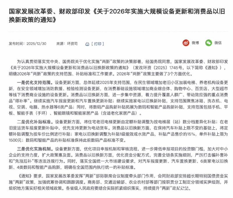 备受瞩目的国家消费品以旧换新("国补")政策有了新进展。 12月30日,国家发展改革委、财政部印发《关于 2026年实施大规模设备更新和消费品以旧换新政策的通知》(下简称《通知》)。南都湾财社记者梳理发现, 《通知》明确2026年继续实施消费品以旧换新,但对补贴范围和力度有所调整。 有业内人士表示,此次《通知》延续消费品以旧换新并不意外。此前十五五规划建议就明确提出"大力提振消 费"。规划指出,以"深入实施提振消费专项行动"为统领,强调统筹促就业、增收入、稳预期;扩大优质消费品和 服务供给;以"放宽准入、业态融合"为重点扩大服务消费;强化"品牌引领、标准升级、新技术应用",打造消费 新场景;加大直达消费者的普惠政策力度等。 实际上,根据日前国家市场监管总局通过"两新"标准提升行动工作成效专题新闻发布会发布消息,2025年1至11 月,中国家电以旧换新超1.28亿台,带动相关商品销售额超2.5万亿元。家具智能等级评定等标准,助推行业智能 升级,龙头企业加速推出中高端智能家具产品,市场规模达100亿元以上,成为家具消费升级的新增长点。 以旧换新对于促进"内循环"具有不可忽视的作用。中国轻工业联合会相关负责人表示, ...