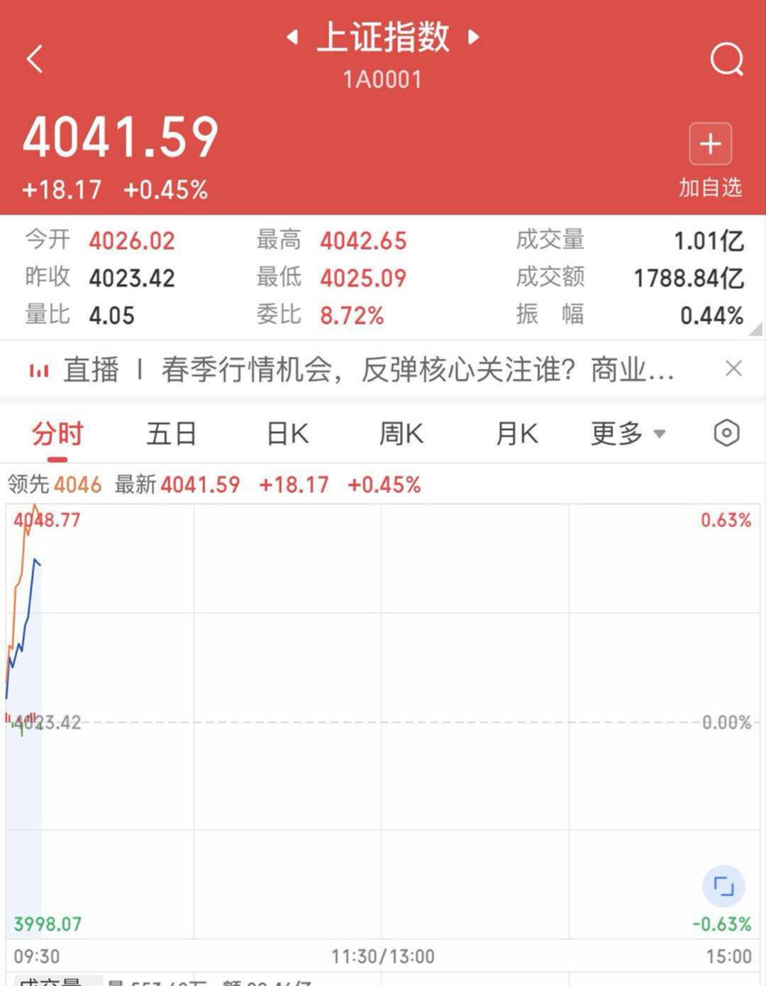 扬子晚报网1月6日讯(记者范晓林薄云峰实习生潘伊笑)新年头两个交易日A股不负众望,沪指刷新10年来新高,多家券商也纷纷有话要说。整体来看,券 商对2026年A股的行情保持乐观,认为"转型牛""长牛""结构牛"等升势远未结束,A股牛市有望在2026年持续。 | ◀ 上证指数 ▶ | | | | --- | --- | --- | | 1A0001 | | | | 4041.59 + | | | | +18.17 +0.45% 加自选 | | | | 最高 4042.65 今开 4026.02 | 成交量 | 1.01亿 | | 昨收 4023.42 最低 4025.09 | 成交额 | 1788.84亿 | | 量比 4.05 委比 8.72% | 振 幅 | 0.44% | | m 直播 春季行情机会, 反弹核心关注谁? 商业... | | | | 分时 王日 周K | 月K | 更多。 0 | | 领先4046 最新4041.59 +18.17 +0.45% | | | | 4048.77 0.63% | | | | 4423.42 0.00% | | | | ப | | | | 3998.07 -0.63 ...