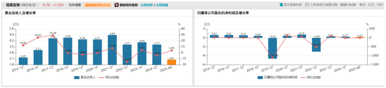 作为营收支柱的硬脑膜补片业务,正面临多重压力。集采政策冲击下的价格体系松动、国产竞品的技术 追赶,叠加自身产品迭代缓慢,共同构成了增长瓶颈。单一产品依赖的商业模式,在市场竞争加剧的背 景下更显脆弱。 研发投入的持续收缩与技术转化的低效,使得第二增长曲线迟迟未现。人工肝、CAR-T等前沿布局与核 心业务缺乏协同,而核心产品创新"断档"的隐患,正让公司在行业变革中逐渐失去主动权,未来发展的 不确定性进一步放大。 业绩增长的背后 本报(chinatimes.net.cn)记者张斯文 于娜 北京报道 冠昊生物的半年报数据看似显现出回暖迹象,营收与利润的双增长为这家曾被视为"再生医学明星"的企 业带来短暂的市场关注。但拉长周期观察,核心业务的增长停滞与结构性矛盾已逐渐显现。这家曾以再 生医学技术为标签的企业,正陷入"短期数据回暖"与"长期发展乏力"的张力之中。 2025年半年报显示,公司营收2.01亿元,同比微增5.89%;归母净利润2040万元,增速仅1.27%。 若将时间轴拉长至五年,这份"平淡无奇"的中报,不过是公司漫长估值消化周期的最新注脚。 Wind数据显示,2020—2024年,公司营收从4.37亿元降至3 ...