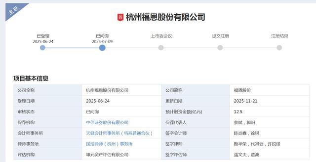 深圳商报·读创客户端记者 张弛 11月20日,深交所官网显示,杭州福恩股份有限公司(以下简称"福恩股份")主板IPO披露了对首轮审 核问询函的回复,详细回应了监管关于公司再生面料技术门槛、产能扩张合理性以及合规性等核心问 题。 | | | □ 杭州福恩股份有限公司 | | | | --- | --- | --- | --- | --- | | 已受理 2025-06-24 | 已同演 2025-07-09 | 上市委会议 | 提交注册 | 注册结果 | | @ | | | | 0 | | 项目基本信息 | | | | | | 公司金称 | 杭州福恩龄份有限公司 | 公司简称 | 福恩般份 | | | 受理日期 | 2025-06-24 | 更新日期 | 2025-11-21 | | | 审核状态 | 已回演 | 预计融资金额(亿元) | 125 | | | 保存机构 | 中信画券股份有限公司 | 保存代表人 | 禁斌,郭阳 | | | 会计师事务所 | 天皇会计师事务所(特殊普通合伙) | 签字会计师 | 陈谈童,徐银 | | | 律师事务所 | 国浩律师(杭州)事务所 | 签字律师 | 颜华荣,代其云,许锐 ...