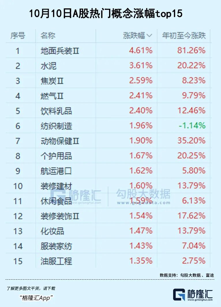10月10日,A股主要指数进一步分化走弱,前期火热的半导体、存储芯片、固态电池等领跌。沪指跌0.94%失守3900点,深成指跌2.7%,创业板指下挫 4.55%,创近半年来最大单日跌幅。 但另一边,军工、公用事业、传统消费、水泥建材等行业逆势明显上涨,其中军工板块更是整体大涨近5%,并贡献了多数的涨停板个股,成为今天表现 最强势的领涨板块。 | 序号 | 名称 | 涨跌幅√ | 年初至今涨跌 | | --- | --- | --- | --- | | 1 | 地面兵装Ⅱ | 4.61% | 81.26% | | 2 | 水泥 | 3.61% | 20.22% | | 3 | 焦炭II | 2.59% | 8.23% | | 4 | 燃气Ⅱ | 2.41% | 9.79% | | 5 | 饮料乳品 | 2.40% | 12.46% | | 6 | 纺织制造 | 1.96% | -1.14% | | 7 | 动物保健工 | 1.90% | 35.20% | | 8 | 个护用品 | 1.67% | 20.25% | | ਰੇ | 航运港口 | 1.62% | 5.80% | | 10 | 裝修建材 | 1.60% ...