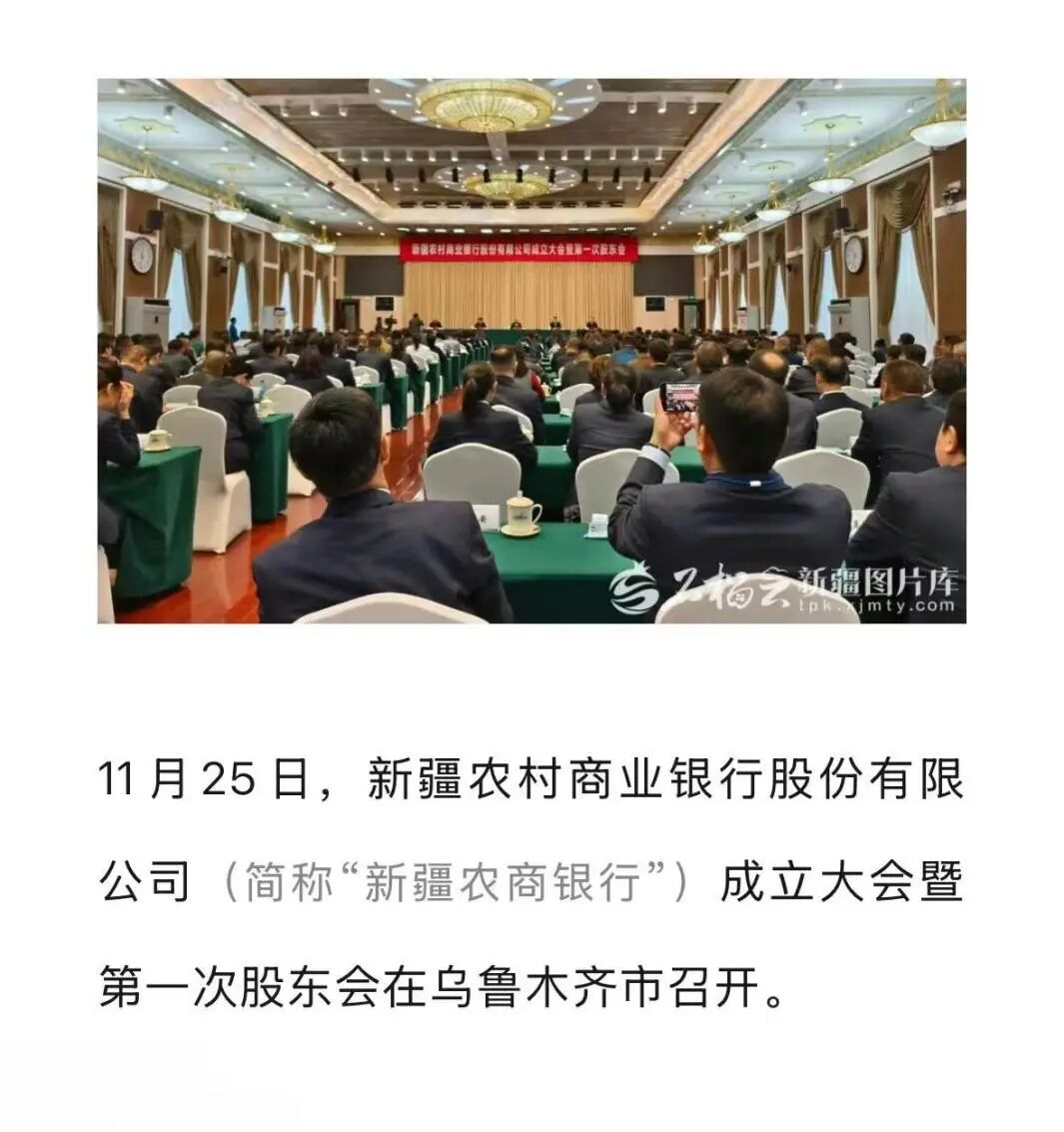 新疆农商银行于今日召开成立大会暨第一次股东会,这标志着全国第六家、西北地区首家省级统一法人农商银行成立,新疆农信系统历时数年的深化改 "新疆发布"消息显示,新疆农商银行将承继新疆农村信用社联合社及55家行社原有业务、资产及债权债务等权利义务,资产规模超过7000亿元。 【导读】获批筹建不到一个月,新疆农商银行召开成立大会暨第一次股东会 11月25日,据"新疆发布"公众号消息,新疆农村商业银行股份有限公司(以下简称新疆农商银行)成立大会暨第一次股东会在乌鲁木齐市召开。 一个月前刚获批同意筹建 10月31日,国家金融监督管理总局正式批复同意筹建新疆农商银行,要求其筹建工作小组严格按照有关法律法规要求办理筹建事宜,自批复之日起6个 月内完成筹建工作。 今年年初,新疆农村信用社统一法人改革方案获国家批复。随后,"积极筹建新疆农商银行"被写入新疆维吾尔自治区政府工作报告,被列为2025年重点 工作。同时,为确保改革顺利推进,新疆还采取了"先试点、再推广"的策略。 3月份,新疆农商银行筹建工作小组等机构发布组建公告,其中提到新疆农村信用社等56家新疆农信法人机构已分别履行内部公司治理程序,召开会议 审议通过以新设合并方式 ...
