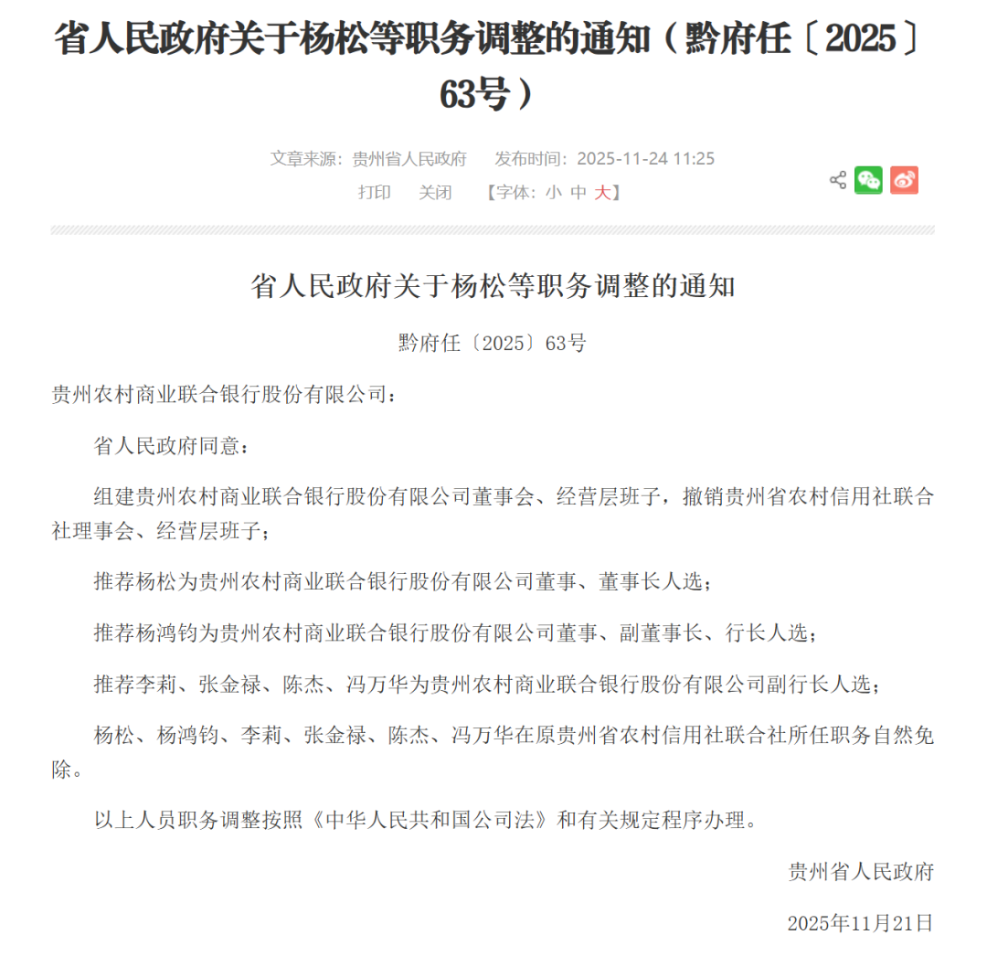 11月24日,贵州省人民政府发布关于杨松等职务调整的通知。贵州省人民政府同意:组建贵州农村商业联合银行股份有限公司董事会、经营层班子,撤销 贵州省农村信用社联合社理事会、经营层班子。 【导读】贵州省人民政府同意组建贵州农商联合银行董事会、经营层班子 筹建中的贵州农商联合银行,最新进展来了! 同时,贵州省人民政府同意:推荐杨松为贵州农商联合银行董事、董事长人选;推荐杨鸿钧为该行董事、副董事长、行长人选;推荐李莉、张金禄、陈 杰、冯万华为该行副行长人选;5人在原贵州省农村信用社联合社所任职务自然免除。 公开信息显示,杨松长期任职于贵州省金融系统。2024年4月,杨松被推荐为贵州省联社理事、理事长人选,同年7月获准出任贵州省联社理事、理事长。 杨鸿钧曾在中国农业银行贵州省分行工作多年,于2024年3月被推荐为贵州省联社理事、副理事长人选,同年9月贵州金融监管局核准其贵州省联社理事、 副理事长、主任的任职资格。 此外,李莉、张金禄、陈杰、冯万华亦任职于贵州省联社系统,目前均为该省联社党委委员、副主任。 | | 2 贵州省农村信用社 关于我们 | 成员机构 | 人才招聘 | 下载中心 | | & 客服热线: 96688 ...