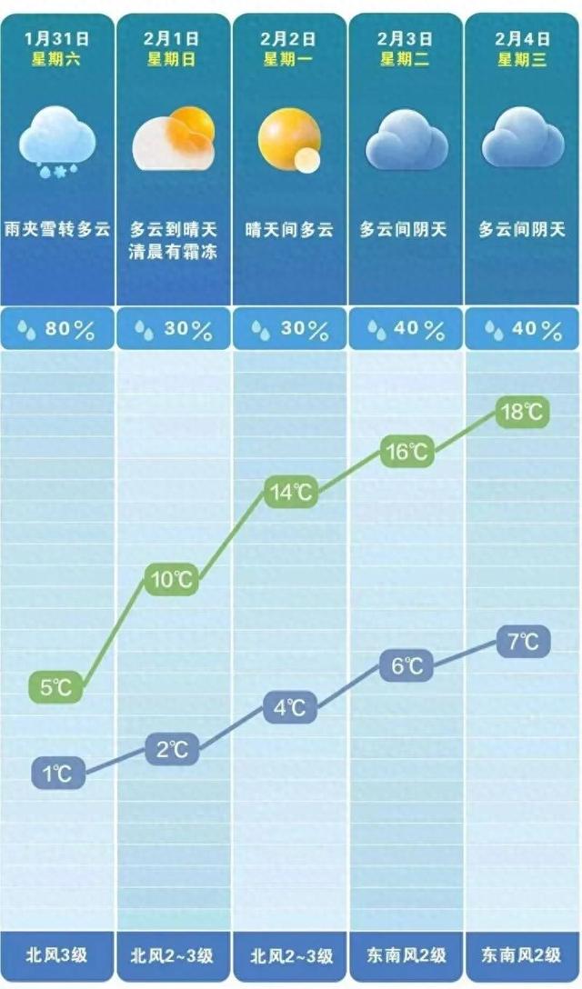 大家都在看: 长沙天气要开启"爬坡"模式了! 短短五天 气温将从冰点边缘蹦到18℃ 不过升温之前 雨夹雪将率先登场 长沙市气象台发布的未来五天天气预报显示,今日(周六)雨夹雪将是主角,最高气温5℃,最低气温 仅1℃,凛冽的北风更添寒意。 长沙天气预报 不过 这股寒意只是短暂停留 2月1日(周日) 天气将切换为多云到晴天,最高气温跃升至10℃,最低气温仍只有2℃。 2月2日(下周一) 晴天间多云的天气让长沙短暂摆脱湿冷,最高气温升至14℃,最低气温4℃。 2月3日到4日 多云间阴天的天气持续在线,气温依旧保持上升势头,最高气温分别达到16℃和18℃,最低气温也分别 攀升至6℃、7℃,温润的东南风取代凛冽北风。 未来几天,长沙天气呈先冷后暖、逐步升温趋势,气温将从冰点边缘一路攀升至接近20℃,但市民朋友 切勿被回暖天气迷惑,防寒保暖仍是首要注意事项:雨夹雪天气出行,务必做好防滑措施,密切留意路 面结冰情况;气温回升后,需根据实际情况适时增减衣物,谨防因温差过大引发感冒。此外,可趁晴好 天气晾晒被褥、衣物,借助阳光驱散冬日潮气,也可走出家门,感受这份冬日里难得的暖意。 需特别注意的是,湖南省气象台预计,1月31日上 ...