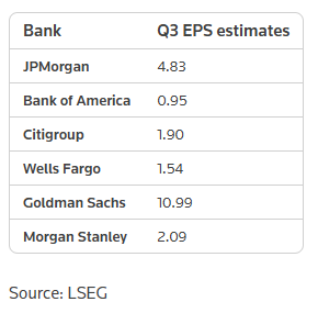 智通财经APP获悉,美股新一轮财报季将于下周拉开帷幕。打头阵的美国六大银行——摩根大通 (JPM.US)、高盛(GS.US)、摩根士丹利(MS.US)、美国银行(BAC.US)、花旗(C.US)以及富国银行 (WFC.US)——将从下周二起陆续公布第三季度业绩。市场目前预计,得益于投行业务的强势复苏,加 上美国经济的韧性令借款人保持良好状态并支撑消费者和商业贷款部门,这六大银行的第三季度业绩将 表现强劲。 与此同时,投资者将密切关注这些银行的经济展望,以及对投行业务和交易业务的预期。Gabelli Funds 投资组合经理Mac Sykes表示:"市场将重点关注信贷环境的任何变化、就业数据的影响以及整体经济前 景。消费者信心有所回落,企业信心仍在演变,我们将观察今年早些时候的市场波动是否留下隐患。" 此外,投资者将关注富国银行在监管机构解除1.95万亿美元资产上限后的增长计划。 | Bank | Q3 EPS estimates | | --- | --- | | JPMorgan | 4.83 | | Bank of America | 0.95 | | Citigroup | 1.90 | | Wells ...