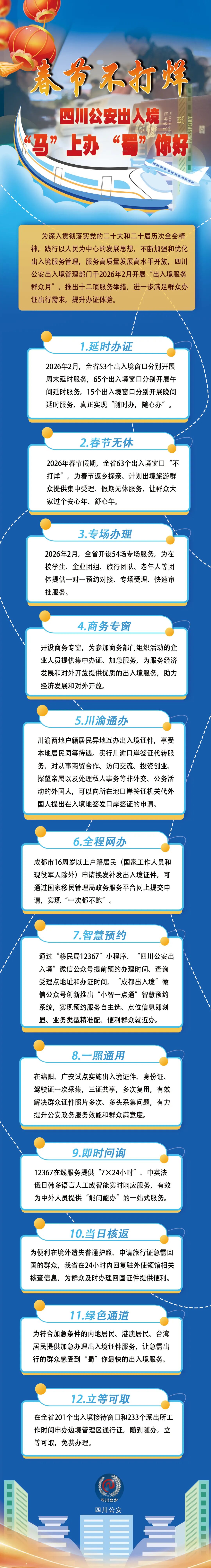 Core Viewpoint - The Sichuan Public Security Exit-Entry Administration will launch a "Exit-Entry Service Month" in February 2026, introducing twelve service measures to enhance the convenience and efficiency of exit-entry services for the public [3]. Group 1: Service Enhancements - Extended service hours will be implemented across 53 exit-entry windows on weekends, 65 windows during lunch hours, and 15 windows in the evenings, allowing for "anytime service" [4]. - During the 2026 Spring Festival, 63 exit-entry windows will remain open to provide uninterrupted service for those returning home or planning to travel abroad [5]. - A total of 54 specialized service sessions will be held to cater to specific groups such as students, corporate teams, travel groups, and the elderly, offering personalized appointment and expedited processing [6]. Group 2: Business and Cross-Region Services - A dedicated business service window will be established to provide expedited processing for business personnel participating in organized activities, supporting economic development and international engagement [7]. - Residents from Sichuan and Chongqing can apply for exit-entry documents in each other's regions, enjoying the same benefits as local residents [8]. Group 3: Digital and Efficient Processing - Chengdu residents aged 16 and above can apply for the renewal or replacement of exit-entry documents online through the National Immigration Administration's service platform, ensuring a "no visit required" process [9]. - A smart appointment system will be introduced via the "Immigration Bureau 12367" mini-program and the "Sichuan Public Security Exit-Entry" WeChat account, allowing users to book appointments and access information conveniently [10]. - A pilot program in Mianyang and Guang'an will allow for the simultaneous collection of exit-entry documents, ID cards, and driver's licenses, enhancing service efficiency and customer satisfaction [11]. Group 4: 24/7 Support and Emergency Services - The 12367 online service will provide 24/7 multilingual support, ensuring that both domestic and foreign individuals can access comprehensive assistance [13]. - For those who lose their ordinary passports abroad, the province will respond to consulate inquiries within 24 hours to facilitate the issuance of return documents [15]. - An expedited service will be available for eligible residents from the mainland, Hong Kong, Macau, and Taiwan, ensuring quick processing of exit-entry documents for urgent travel needs [16]. - In 2016, 201 exit-entry reception windows and 233 police stations will offer immediate processing for border management area permits, allowing for on-the-spot issuance [17].