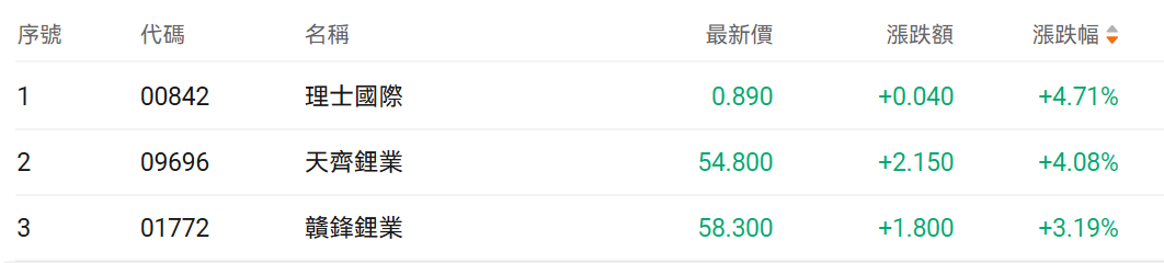1月12日,港股锂业股早盘上扬,截至发稿, 涨超4%, 涨超3%。 | 序號 | 代碼 | 名稱 | 最新價 | 漲跌額 | 漲跌幅 ◆ | | --- | --- | --- | --- | --- | --- | | 1 | 00842 | 理士國際 | 0.890 | +0.040 | +4.71% | | 2 | 09696 | 天齊鋰業 | 54.800 | +2.150 | +4.08% | | 3 | 01772 | 赣锋锂業 | 58.300 | +1.800 | +3.19% | 消息面上,1月12日早,碳酸锂期货主力合约封住涨停,涨幅9%,报156060元/吨。财政部、税务总局1月9日发布《关于调整光伏等产品出口退税政策 的公告》。其中指出,自2026年4月1日起至2026年12月31日,将电池产品的增值税出口退税率由9%下调至6%;2027年1月1日起,取消电池产品增值税 出口退税。 据期货日报,中信期货分析师王美丹认为,从需求角度看,电池企业可能在4月之前"抢出口"而增加电池排单,利好短期碳酸锂需求;到2027年取消退 税之前,电池厂仍有持续的"抢出口"需求。因此,短期来看,对碳酸锂价 ...