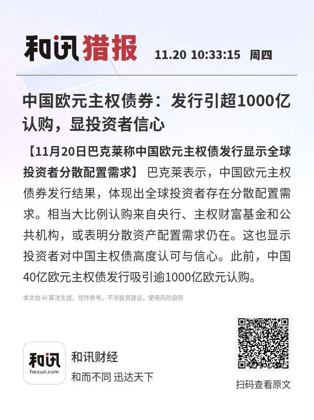 【11月20日巴克莱称中国欧元主权债发行显示全球投资者分散配置需求】巴克莱表示,中国欧元主权债 券发行结果,体现出全球投资者存在分散配置需求。相当大比例认购来自央行、主权财富基金和公共机 构,或表明分散资产配置需求仍在。这也显示投资者对中国主权债高度认可与信心。此前,中国40亿欧 元主权债发行吸引逾1000亿欧元认购。 本文由 AI算法生成,仅作参考,不涉投资建议,使用风险自担 ...