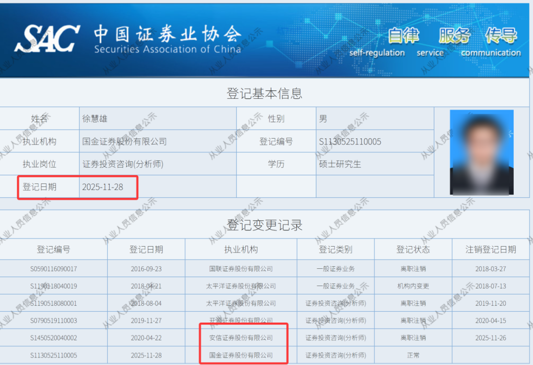 【导读】国投证券汽车分析师 团队 集体跳槽 中国基金报记者 莫琳 国投证券研究所大震荡! 同时,数据显示,截至12月3日,国投证券分析师人数已降至61人,较2024年底减少16人,降幅超20%。 汽车团队分析师集体离职 加入国金证券 系统显示, 徐慧雄、夏心怡、何冠男、者斯琪、杨颖于11月27日 至 12月2日期间先后入职国金证券 。 公开资料显示,徐慧雄是国投证券汽车行业首席分析师,南京大学经济学硕士学位。 | SACH | 中国证券业协 | | | | | | --- | --- | --- | --- | --- | --- | | | | 登记基本信息 | | | | | | 徐慧雄 | 一个 性别 | 男 | | | | 丸业机构 | 国金证券股份有限公司 | 登记编号 | S1130525110005 | | | | 执业岗位 | 证券投资咨询(分析师) | 学历 | 硕士研究生 | | | | 登记日期 | 2025-11-28 | | | | | | | | 登记变更记录 | | | | | 登记编号 | 登记日期 | 执业机构 | 登记类别 | 登记状态 | 注销登记日期 | | S0590 ...