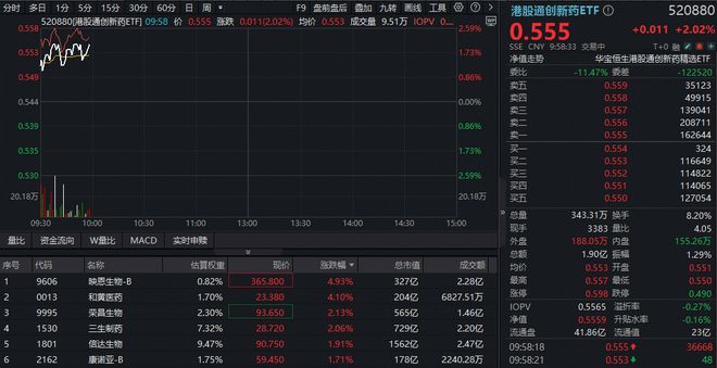 1月8日早盘,港股延续调整,创新药再度逆市领涨!纯度100%的港股通创新药ETF(520880)连续第4 日上涨,高开后再度冲上2%,一举站上60日线!成份股映恩生物-B涨超6%居首,和黄医药涨超4%。 | | | 分时 多日 1分 5分 15分 30分 60分 日 周 · | | | | | | F9 盘前盘后 盛加 九转 西氏 工具 @ 0 | > | 港股通创新药ETF O | | 520880 | | --- | --- | --- | --- | --- | --- | --- | --- | --- | --- | --- | --- | --- | | 0.556 | | | | | 520880JA股通创新资ETF] 09:58 价 0.555 涨跌 0.011(2.02%) 均价 0.553 股交盘 9.51万 IOPV 0. | | | | 2.59% | 0.555 | | +0.011 +2.022 | | 0.553 July 1 | | | | | | | | | 1.7393 | SSE CNY 9:58:33 文理中 | | T+0 图 / 图 + | | | | | | | ...