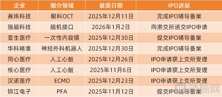 过去几年,创新医疗器械市场多个细分领域诞生了"国产第一股",如血液透析设备第一股山外山,国产 心脏电生理第一股惠泰医疗、中国正畸第一股时代天使、国内手术机器人第一股天智航。 近期,动脉网发现:更多创新医疗器械细分赛道走到IPO阶段,如眼科OCT领域的赛炜科技完成IPO辅 导备案,脑机接口领域强脑科技向港交所递交IPO申请,一次性内窥镜企业普生医疗已提交IPO辅导备 案,人工心脏领域核心医疗与同心医疗的IPO申请先后获上交所受理…… 在此之前,这些创新医疗器械细分市场均未有企业上市。这也预示未来两年将有一批"细分市场第一 股"上市。 | 174 | 细分领域 | 披露日期 | IPO进展 | | --- | --- | --- | --- | | 塞炜科技 | 眼科OCT | 2025年12月11日 | 完成IPO辅导备案 | | 强脑科技 | 脑机接口 | 2026年1月2日 | 向港交所递交IPO申请 | | 普生医疗 | 一次性内窥镜 | 2025年12月30日 | 提交IPO辅导备案 | | 华科精准 | 神经外科机器人 | 2025年12月30日 | 完成IPO辅导备案 | | 同心医疗 | 人工心脏 ...