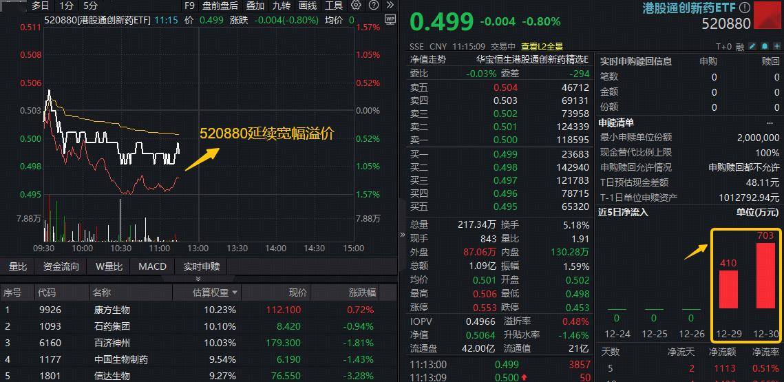 12月22日,港股通创新药板块三连涨后首度回调,高人气港股通创新药ETF(520880)午后一度跌近 1%,场内再现高频溢价,显示买盘资金较为活跃。 成分股方面,创新药龙头跌多涨少,康方生物、中国生物制药双双跌逾2%,云顶新耀、诺诚健华、亚 盛医药-B等多股跌逾3%。 | | | 分时 多日 1分 5分 15分 30分 * | | | | | F9 盘前盘后 鼎加 九转 画线 工具 份 | | 港股通创新药ETF O | | 520880 | | --- | --- | --- | --- | --- | --- | --- | --- | --- | --- | --- | --- | | 0.53 | | | | | 520880[程品通创新药ETF] 14:19 价 0.524 涨跌 -0.004[-0.76%) 均价 0.526 成交量 | | | | 0.524 | | -0.004 -0.76% | | | | | | | | | | | SSE CNY 14:19:16 交易中 | | T+0-B0 / 8 + | | 0.532 | | | | | | | | 0.7196 | ◎值走势 | ...