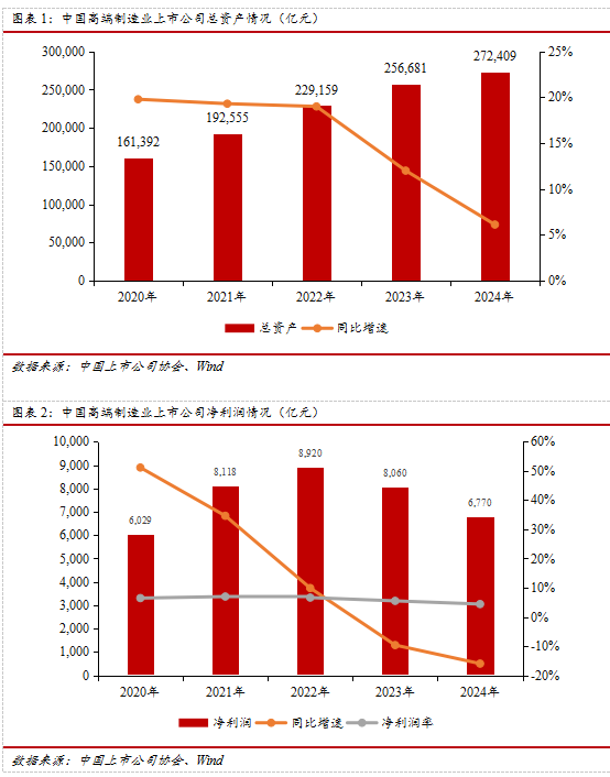 资产规模增速快,发展韧性强 截至2024年底,高端制造业上市公司的总资产规模达到27.24万亿元,占A股上市公司总资产的6.07%, 较2023年末同比增长6.13%,较2020年末增长68.79%。年均复合增长率为13.98%,高于A股整体复合增 长率9.40%,资产规模增速较快。 收入规模持续增长,由2020年的9.36万亿元增长至2024年的15.41万亿 元,复合增长率为13.27%,增速显著高于GDP增速,实现净利润的复合增长率为12.28%,盈利水平整 体有较大提升,表明高端制造业公司仍处于快速发展阶段,表现出了强劲的发展韧性。 智通财经APP获悉,11月14日,中国上市公司协会发布《中国上市公司高端制造业发展报告(2025)》。 报告显示,过去5年,在国家战略支持和精准产业政策的引领下,在国际产能合作深化及企业内生动力 的驱动下,我国高端制造业上市公司家数由2020年的1,661家增加至2024年的2,503家,复合增长率为 10.80%,同期高于A股上市公司数量复合增长率6.52%;总市值达到32.47万亿元。高端制造业总体资产规 模和收入水平持续增长,资本结构稳健,行业整体处于由高速发展向高 ...