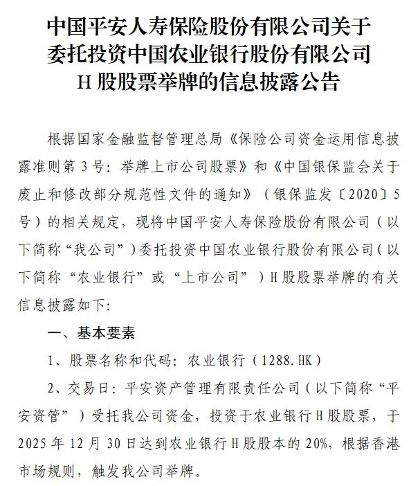 险资入市脚步不停。 1月7日,平安人寿披露公告称,平安资管受托该公司资金,投资于农业银行H股股票,于2025年12月30 日达到农业银行H股股本的20%。根据香港市场规则,触发举牌。 这只是2025年险资举牌热情高涨的一个缩影。 记者据中国保险行业协会官网公告统计,2025年全年险资共举牌35次,创下2016年以来新高。那么, 2026年险资举牌是否会延续高频率? 银行股成"香饽饽" 保险公司举牌上市公司股票,是指保险公司持有或者与其关联方及一致行动人共同持有一家上市公司已 发行股份的5%,以及之后每增持5%时,按照相关法律法规规定,在3日内通知该上市公司并予以公告 的行为。 值得一提的是,这已经是平安人寿第四次举牌农业银行H股。2025年2月、5月、8月,平安人寿曾先后 增持农业银行H股,持有该行H股的比例分别突破5%、10%、15%。 在刚刚过去的2025年,平安人寿是当之无愧的"举牌大户",其中当属银行股最受青睐。除农业银行H股 外,平安人寿还于2025年1月8日买入716.9万股邮储银行H股,持股比例升至5.01%,构成2025年首例险 资举牌。随后,平安人寿在5月、8月再度增持邮储银行H股,总持股数 ...