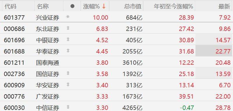 【免责声明】本文仅代表作者本人观点,与和讯网无关。和讯网站对文中陈述、观点判断保持中立,不对所包含 内容的准确性、可靠性或完整性提供任何明示或暗示的保证。请读者仅作参考,并请自行承担全部责任。邮箱: news_center@staff.hexun.com | 代码 | 名称 | ● | 涨幅% ↓ | 总市值 | 年初至今涨幅% | | | --- | --- | --- | --- | --- | --- | --- | | 601377 | 兴业证券 | 章 | 10.00 | 684亿 | 28.39 | 7.92 | | 000686 | 东北证券 | 1 | 6.83 | 231亿 | 27.42 | 9.86 | | 601696 | 中银证券 | 1 | 4.52 | 405亿 | 30.89 | 14.57 | | 601688 | 华泰证券 | 1 | 4.45 | 2055亿 | 31.68 | 22.77 | | 601211 | 国泰海通 | | 3.80 | 3610亿 | 12.22 | 20.48 | | 002736 | 国信证券 | 委 | 3.58 | 1392亿 | 25 ...