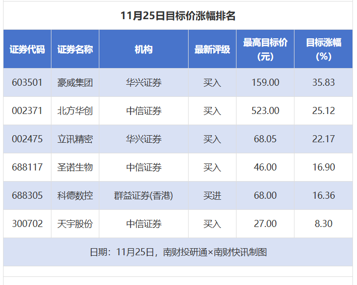 从券商推荐家数来看,11月25日有14家上市公司得到券商推荐,其中梅花生物、维力医疗、东航物流等 获得1家推荐。 首次覆盖方面,11月25日券商共给出了3次首次覆盖,其中维力医疗获得中信建投证券给予"买入"评 级,东航物流获得中泰证券给予"买入"评级,爱博医疗获得平安证券给予"推荐"评级。 南财投研通数据显示,11月25日,券商给予上市公司目标价共6次,按最新收盘价计算,目标价涨幅排 名居前的公司有豪威集团、北方华创、立讯精密,目标价涨幅分别为35.83%、25.12%、22.17%,前两 者都属于半导体行业、后者属于消费电子行业。 | | | 11月25日目标价涨幅排名 | | | | | --- | --- | --- | --- | --- | --- | | 证券代码 | 证券名称 | 机构 | 最新评级 | 醫壇自極松 (元) | 目标涨幅 (%) | | 603501 | 豪威集团 | 华兴证券 | 买人 | 159.00 | 35.83 | | 002371 | 北方华创 | 中信证券 | 买人 | 523.00 | 25.12 | | 002475 | 立讯精密 | 华兴证券 | 买入 | 6 ...