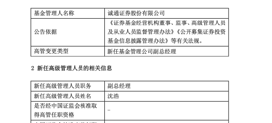 炒股就看金麒麟分析师研报,权威,专业,及时,全面,助您挖掘潜力主题机会! 文/新浪财经上海站 时行工作室 在券商高管频繁流动的市场环境下,诚通证券再度迎来高层人事调整。 8月26日发布公告,沈浩正式履新,出任公司副总经理。这一任命不仅是沈浩职业生涯的重要节点,也 折射出诚通证券在当前竞争格局下的人才战略与业务诉求。 | 基金管理人名称 | 诚通证券股份有限公司 | | --- | --- | | 公告依据 | 《证券基金经营机构董事、监事、高级管理人员 | | | 及从业人员监督管理办法》《公开募集证券投资 | | | 基金信息披露管理办法》等有关法规。 | | 高管变更类型 | 新任基金管理公司副总经理 | | 新任高级管理人员职务 | 副总经理 | | --- | --- | | 新任高级管理人员姓名 | 沈浩 | | 是否经中国证监会核准取 | | | 得高管任职资格 | | 公开资料显示,沈浩在金融与证券领域拥有超过15年的从业经验,职业轨迹横跨资产管理、风险控制与 证券业务等多个板块。 他先后在华融晋商资产管理股份有限公司担任法律事务部、风险管理部副总经理(主持工作),在华融 证券股份有限公司担任法 ...