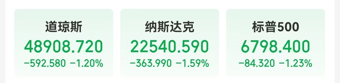 每经编辑|杜宇 当地时间2月5日,美股三大指数集体收跌,道指下跌592.58点,跌幅1.20%;纳指跌1.59%;标普500指数跌1.23%。 热门科技股普跌,超微电脑、高通跌超8%,亚马逊跌超4%,AMD跌超3%,特斯拉跌超2%,英伟达跌超1%。 微软跌4.95%,市值一夜蒸发1524亿美元(约合人民币10573亿元)。 | 微软 | | | --- | --- | | MSFT us 空 | | | 408.300 昨收 414.190 量比 0.98 393.670 - | | | 392.330 市值 2.92万亿 换 0.90% | | | -20.520 -4.95% 开 407.440 市盈™ 24.51 额 262.24亿 | | | 异动解读:评级下调+云业务增长放缓+软件... ● × 1.7 16. | | | 盘后 391.070 - -2.600 -- -0.66% 0 0 17:12 美东时间 | | | 盘中 × 1 日K × 周K × 月K × 五日 × | 更多▼ | | 时间05:00 均价:398.905 最新393.670 涨幅-4.954% | | | 436.050 ...