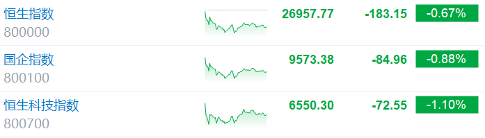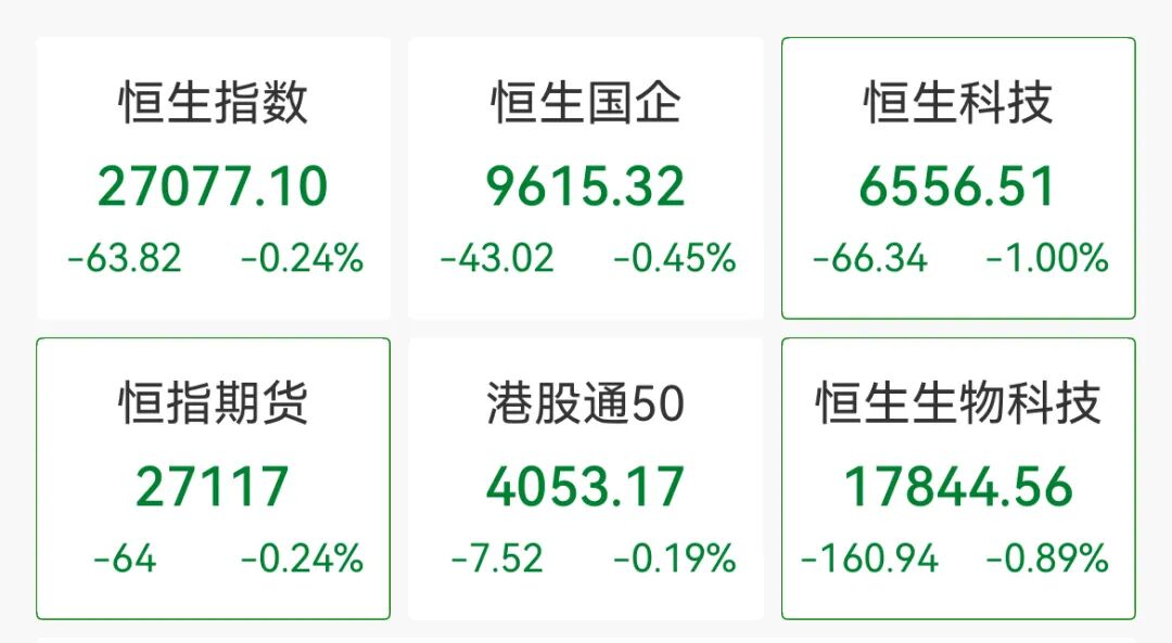 【导读】港股三大指数低开,科指跌超1%,黄金股普涨! 10月6日,港股三大指数开盘走弱,恒生指数开跌0.5%,恒生科技指数开跌1.1%。 截至发稿,恒生指数跌0.24%,恒生科技指数跌1%。 | 恒生指数 | 恒生国企 | 恒生科技 | | --- | --- | --- | | 27077.10 | 9615.32 | 6556.51 | | -63.82 -0.24% | -43.02 -0.45% | -66.34 -1.00% | | 恒指期货 | 港股通50 | 恒生生物科技 | | 27117 | 4053.17 | 17844.56 | | -64 -0.24% | -7.52 -0.19% | -160.94 -0.89% | 板块上来看,有色金属板块领涨,钴金属、涉矿、贵金属等概念个股涨幅居前;电气设备、日常消费零售、半导体等板块震荡调整。 今日现货黄金开盘快速走高,向上触及3920美元/盎司,日内涨0.87%,续创历史新高。 华侨银行环球经济与市场研究主管Heng Koon How表示,随着全球零售投资需求持续升温,黄金的涨势毫无放缓迹象。由去美元化担忧推动的强劲避险资 金流入,正支撑着黄 ...