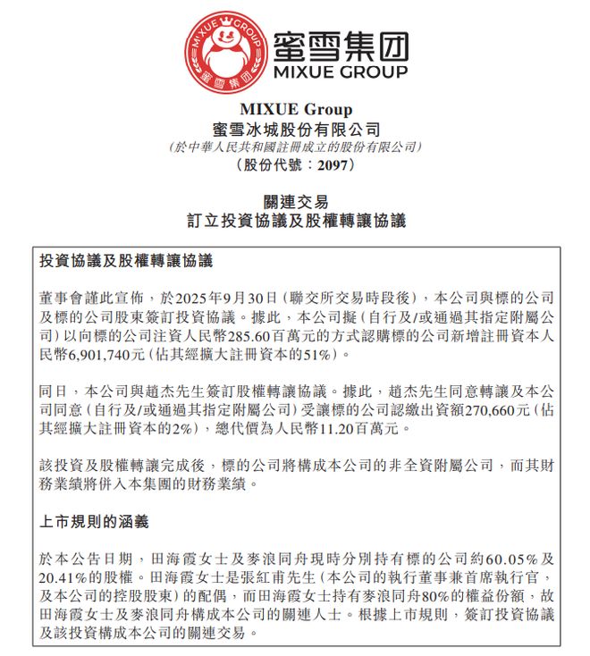 继咖啡品牌"幸运咖"之后,蜜雪冰城准备卖啤酒了。 10月1日,蜜雪集团(HK.2097)于香港联交所发布公告,宣布以2.856亿元人民币增资福鹿家(郑州) 企业管理有限公司,并以1120万元收购其2%股权,交易完成后合计持股53%。从持股比例看,股权转 让完成后,蜜雪集团将成为福鹿家第一大股东。 该投资及股权转让完成后,福鹿家将构成蜜雪集团非全资附属公司,福鹿家财务业绩将并入蜜雪集团财 务业绩。蜜雪集团的产品品类,将从现制果饮、茶饮、冰淇淋和咖啡延伸至现打鲜啤。 公告显示,福鹿家旗下有现打鲜啤品牌"鲜啤福鹿家",主营每500ml杯装单价6—10元的现打鲜啤产品, 截至2025年8月31日,已布局约1200家门店,覆盖全国28个省区市。 值得注意的是,此次交易因关联属性备受关注:鲜啤福鹿家实际控制人为田海霞,而田海霞是蜜雪冰城 创始人张洪超的配偶,构成蜜雪集团 "关联人士"。交易定价参考第三方评估结果,鲜啤福鹿家截至 2025年8月31日的股权市场价值评估区间为2.447 亿元至2.766亿元,蜜雪此次投入略高于评估上限。 财务资料显示,福鹿家的除税后纯利2023年为亏损152.77万元,2024年扭亏为盈,为 ...