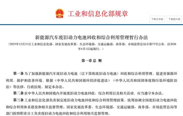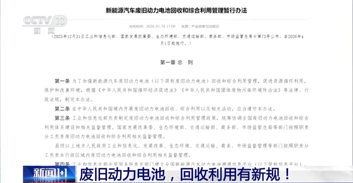 21世纪经济报道记者冉黎黎 北京报道2026年1月16日,工业和信息化部、国家发展改革委、生态环境 部、交通运输部、商务部、市场监管总局等六部门联合印发《新能源汽车废旧动力电池回收和综合利用 管理暂行办法》(以下简称《管理办法》),自2026年4月1日起施行。 当日,工业和信息化部举行新闻发布会,介绍有关情况。记者从发布会上了解,此前已有一些行业规范 性文件印发实施,但对废旧动力电池流向的引导和管理力度不够,难以有效遏制非法拆解等不规范行 为,而《管理办法》作为联合部门规章,法律约束力大幅提升。 值得注意的是,《管理办法》重点设计"车电一体报废"制度,明确报废新能源汽车时应当带有动力电 池,否则按照有关规定认定为车辆缺失。另外,一段时间以来,一些企业将废旧动力电池在检测、分 类、拆分、重组等处理的基础上,制造出新的电池产品,应用于通信基站备用电源等领域,这也就是通 常所说的"梯次利用"电池。目前,市场上的"梯次利用"电池产品有符合所应用领域质量标准要求的,也 有不符合的,导致一些企业和消费者难以判别合格品和不合格品,对"梯次利用"的概念容易产生混淆。 为了消除企业和消费者可能存在的认识误区,《管理办法》中不再 ...