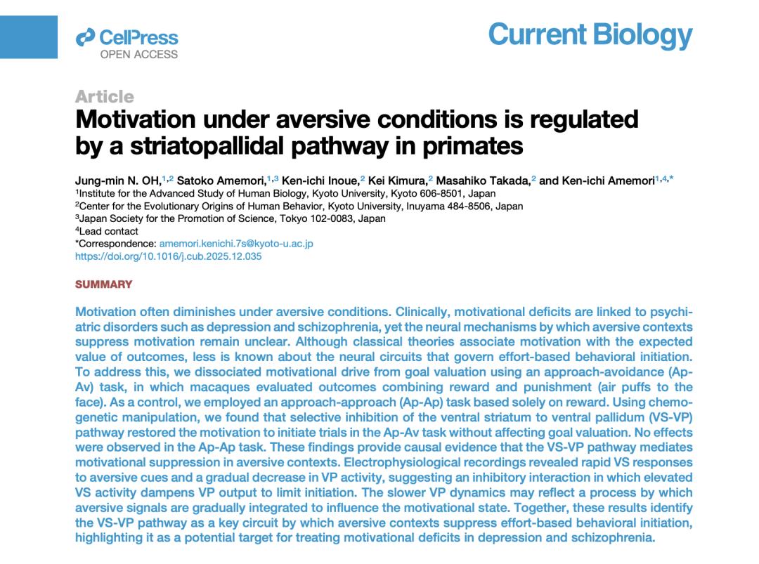 几乎每个人都经历过这样的时刻:明明知道事情并不复杂,比如给领导打一个电话、打开一份拖了很久的文档,或者开始准备一场让人紧张的汇报,可真 正要行动时,却像被什么东西按住了一样,迟迟无法开始。这种体验常常被误解为拖延、懒惰或意志力不足, 一项发表在《当代生物学》(Current Biology)的最新研究则提示,问题可能并不在"想不想",而在于大脑里真的存在一套专门"踩刹车"的机制。 京都大学高等人类生物学研究所的研究团队选择从灵长类动物入手,试图把"知道要做"和"真正开始做"这一步拆分开来。他们训练猕猴完成两类任务,一 类任务只有奖励,完成后能得到水;另一类任务则在奖励之外,附带一个不舒服的惩罚,比如朝脸上吹一股气。在每一次任务开始前,猴子都可以自由决 定要不要启动任务。研究者关注的不是猴子最后选了什么,而是一个更基础的问题:它们愿不愿意迈出第一步。 在医学上,当这种"启动不了"的状态变得严重时,被称为意志缺乏症。患者并非不知道该做什么,也不是对结果毫无兴趣,而是大脑迟迟无法发出"开 始"的信号。这种症状在抑郁症、精神分裂症以及帕金森病中都很常见,严重影响日常生活和社会功能。长期以来,神经科学认为动机主要来自对 ...