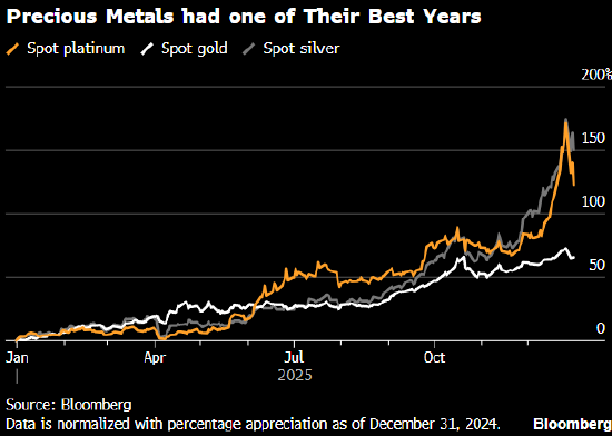 周三 ,白银、铂金和钯金的价格均下跌超过5%,但市场热情丝毫没有减弱的迹象。 Chanana表示,"2026年的形势依然有利,利率下调、财政和地缘政治局势动荡,这些都是支撑因素。但 仓位似乎已经过高,因此回调可能会很剧烈。" 金价下跌0.6%,至每盎司4311.8美元。彭博美元指数在前一交易日小幅上涨后持稳。白银价格下跌超过 6%,至每盎司71.4美元。 来源:环球市场播报 黄金和白银在2025年最后一个交易日下跌,但两者仍势将创下年度纪录涨幅,成就贵金属的出色之年。 现货黄金跌至每盎司4311美元左右,白银也跌向每盎司70美元。在2025年经历了看似势不可挡的涨势 后,这两种金属在12月剧烈波动,接连触及历史新高,黄金更是创下了自1979年以来的最佳年度表现, 随后随着投资者从过热的涨势中获利了结,金银回吐了部分涨幅。 剧烈的市场波动促使芝商所集团宣布提高贵金属期货保证金要求,这是在一周内第二次上调。此举可能 会抑制部分市场热情,因为这将迫使交易员在交易贵金属时提供更多抵押品。 "2025年最令人惊讶的是,'避险'金属——尤其是白银——是如何转变为动量交易的,"新加坡盛宝银行 首席市场策略师Charu Ch ...