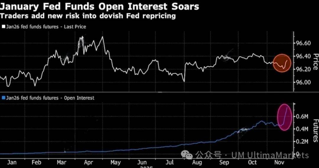 姗姗来迟的9月份就业数据上周公布后,呈现出喜忧参半的局面,利率预期开始转变。随后,纽约联储行长John Williams上周五表示,鉴于劳动力市场走 软,他认为联储会在近期内仍有再次降息的空间。他的这番讲话进一步加剧了降息预期。 「联储会意见分歧很大」,但看起来「鸽派超过了鹰派」,Brandywine Global Investment Management的投资组合经理Tracy Chen表示。 今日Ultima Markets 为您带来了美联储 12 月降息预期升温与市场联动的深度解析。 关键词:美联储、12 月降息、联邦基金期货、鸽派表态、美债收益率、净多头头寸、劳动力市场 简介:聚焦交易员对美联储12 月降息的大举押注,解析官员鸽派信号与疲软经济数据的推动作用,探讨期货市场仓位激增与美债市场反应的联动逻辑, 助您把握利率预期波动中的交易机遇与风险。 投资者大举押注联储会将在下个月的政策会议上再次降低利率,扫除上周对降息概率的疑虑,并为美国债券上涨打下基础。 过去三个交易日,联邦基金期货合约新增仓位激增,1月份合约上周连续两日创下单日成交量纪录。市场定价目前显示,联储会12月会议上下调25个基点 的概率 ...