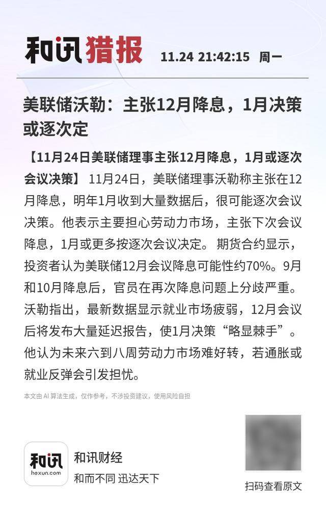 扫码查看原文 和讯财经 和而不同 迅达天下 【11月24日美联储理事主张12月降息,1月或逐次会议决策】11月24日,美联储理事沃勒称主张在12月 降息,明年1月收到大量数据后,很可能逐次会议决策。他表示主要担心劳动力市场,主张下次会议降 息,1月或更多按逐次会议决定。期货合约显示,投资者认为美联储12月会议降息可能性约70%。9月和 10月降息后,官员在再次降息问题上分歧严重。沃勒指出,最新数据显示就业市场疲弱,12月会议后将 发布大量延迟报告,使1月决策"略显棘手"。他认为未来六到八周劳动力市场难好转,若通胀或就业反 弹会引发担忧。 本文由 AI算法生成,仅作参考,不涉投资建议,使用风险自担 和讯猎报 11.24 21:42:15 周- 美联储沃勒:主张12月降息,1月决策 可能多次元 【11月24日美联储理事主张12月降息,1月或逐次 会议决策】 11月24日,美联储理事沃勒称主张在12 月降息,明年1月收到大量数据后,很可能逐次会议 决策。他表示主要担心劳动力市场,主张下次会议 降息,1月或更多按逐次会议决定。 期货合约显示, 投资者认为美联储12月会议降息可能性约70%。9月 和10月降息后,官员在 ...
