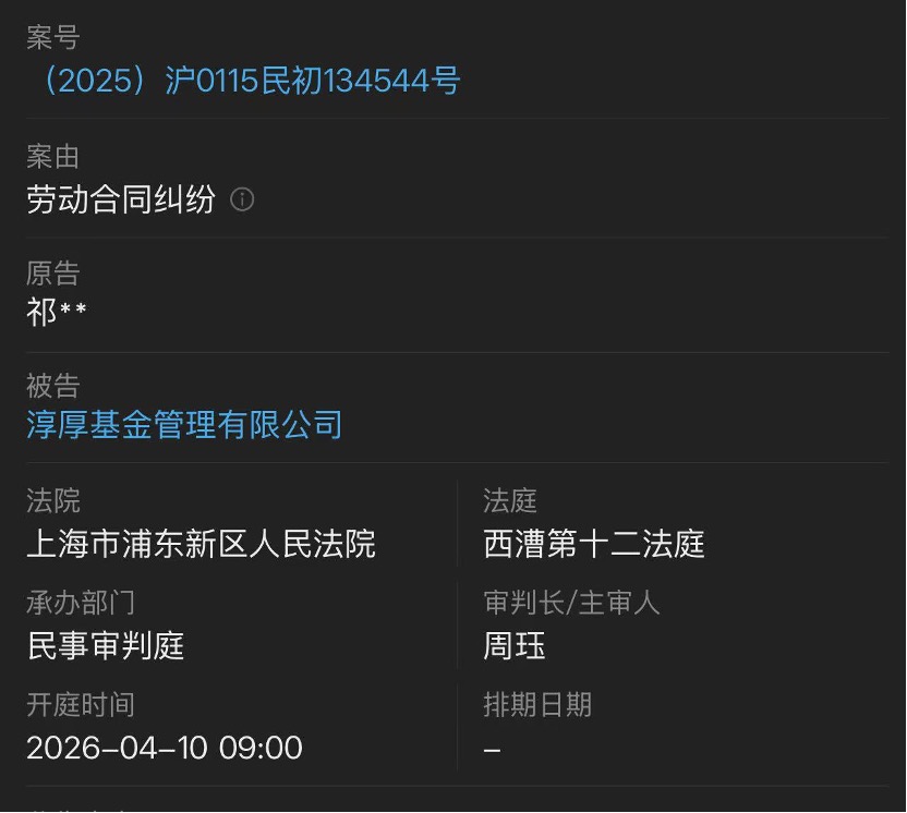 智通财经记者 | 韩理 2026年伊始,金融行业出现了多起劳动纠纷。 近日上海高级人民法院披露了一则劳动纠纷,淳厚基金前固定收益投资部总监祁洁萍因劳动合同纠纷, 将老东家淳厚基金诉至法庭,该案定于今年4月10日开庭审理。 对于此次纠纷,淳厚基金回应智通财经称,近期存在一起已离职员工的劳动纠纷。此类纠纷在企业经营 过程中属于正常的个案范畴,仅为双方劳动关系解除后的个别权益分歧,与公司日常经营管理无任何关 联,更不会对公司核心业务推进及战略发展规划产生影响。 智通财经梳理公开资料发现,2018年,祁洁萍加入淳厚基金,担任总经理助理兼固定收益部投资总监, 管理规模最高的时候超过280亿元。在此之前,她就职于永赢基金,任固定收益部投资总监。 这并非祁洁萍首次将老东家状告至法庭,2025年3月,她首次向法院提起诉讼,不过很快就撤诉了。根 据此前媒体的报道,祁洁萍的劳动合同于2025年1月到期,2024年12月开始双方开始协商续签,祁洁萍 曾同意续签,但因条款细节未达成一致而未能完成签约。至2025年2月底,祁洁萍正式提出离职,公司 以"股东股权纠纷未解决"为由,要求其暂缓离职(等待3—6个月),以维持核心团队稳定。祁洁 ...